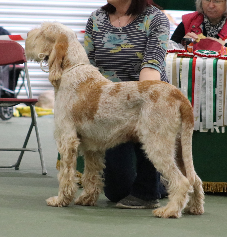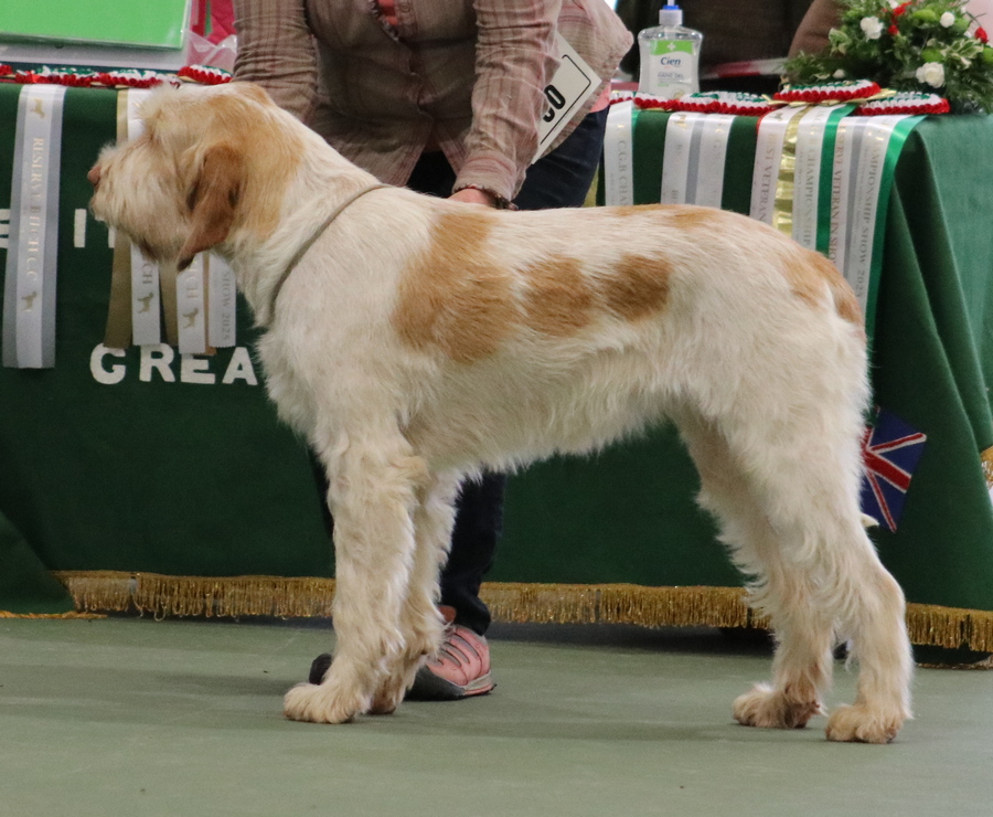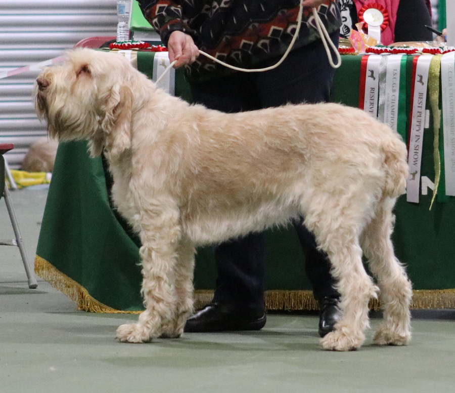Hastings | Little bit generic in shape for me, lacking topline and a bit long and short on the leg. Short on upper arm, moderate rear angulation. Both skull and muzzle a bit short, not the long lean head of Spinone. Eye shape was correct and of good colour. Good bone and feet. Coat needed some attention. |
