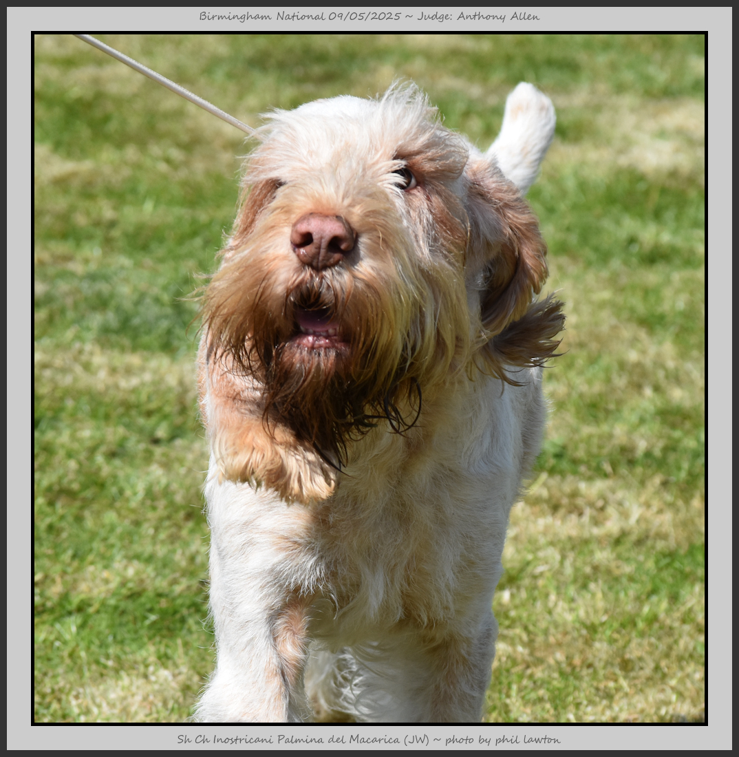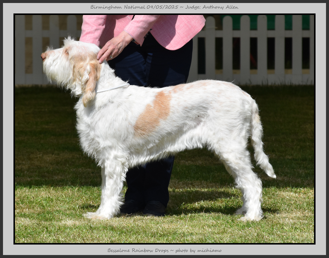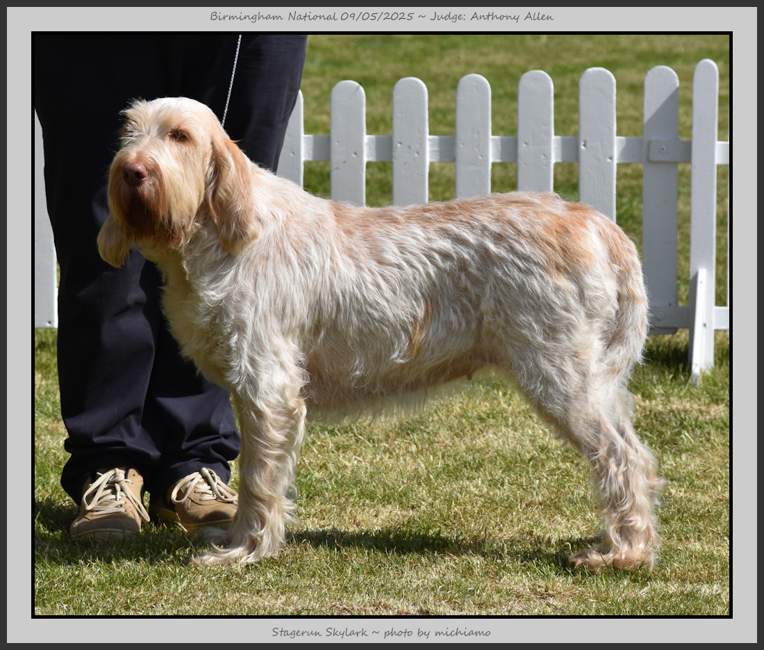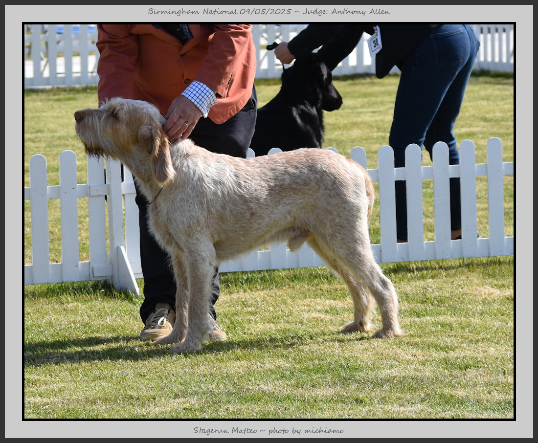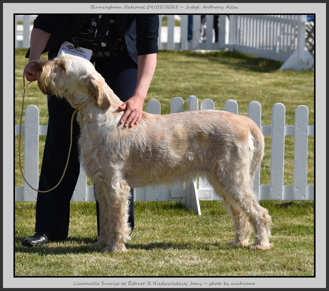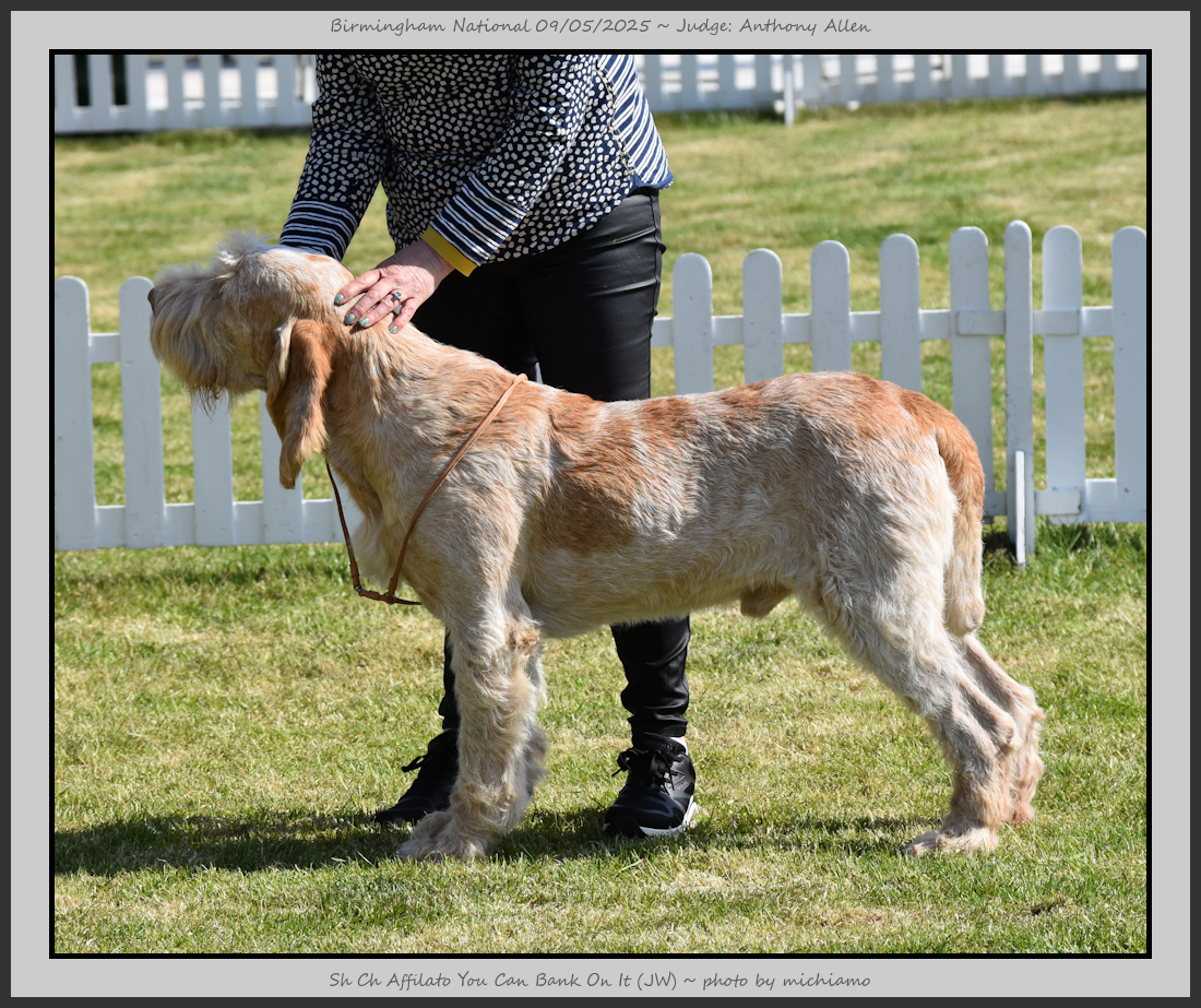 Clark & Sharp | A most impressive Italian Spinone dog who has the most wonderful outline and was in wonderful muscle condition and coat. He has a glorious head and expression. Correct topline and carries his tail correctly. On the move he just cannot be ignored and he really impressed in profile today as the big ring really suits him. Judge Lee Cox. |