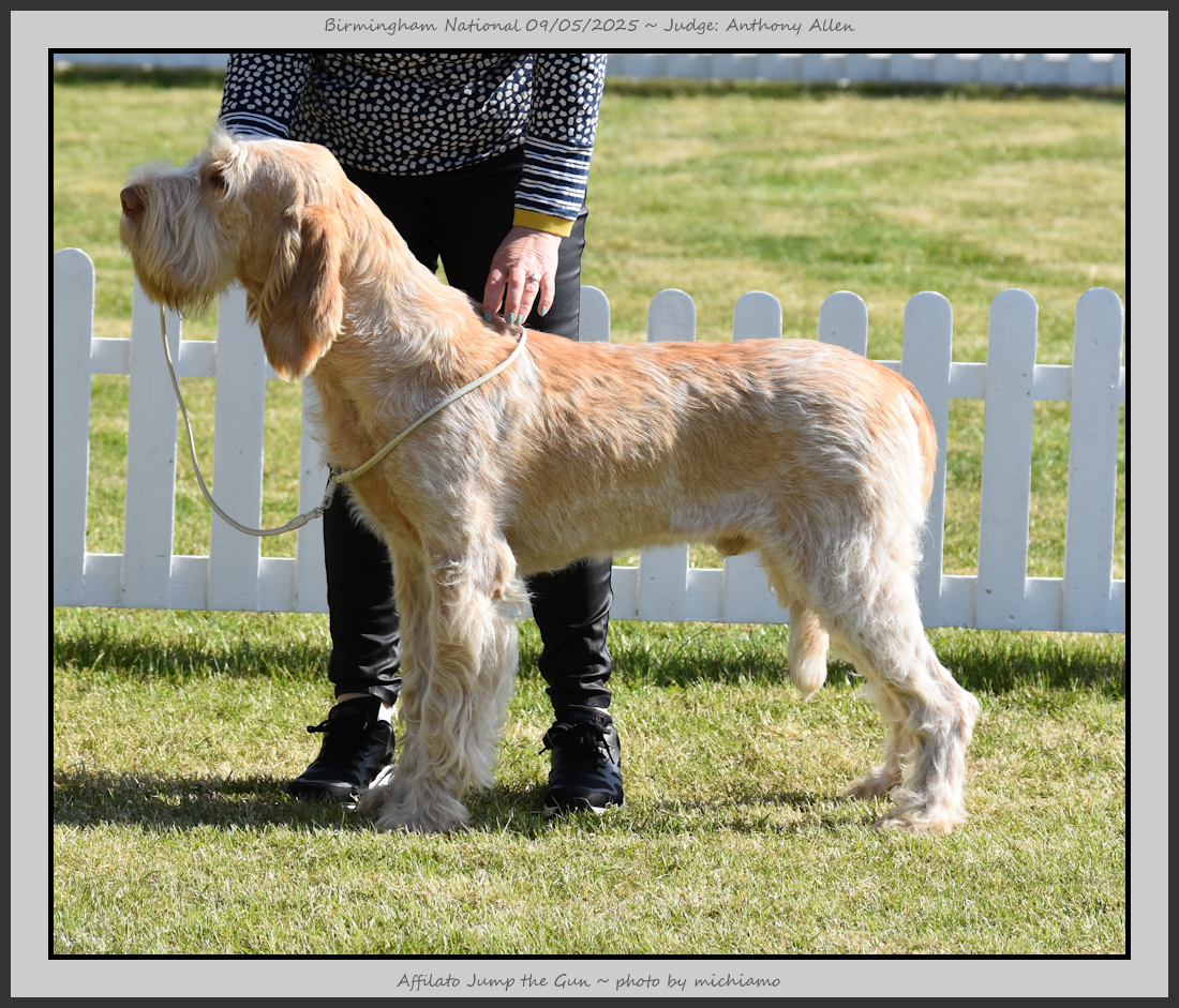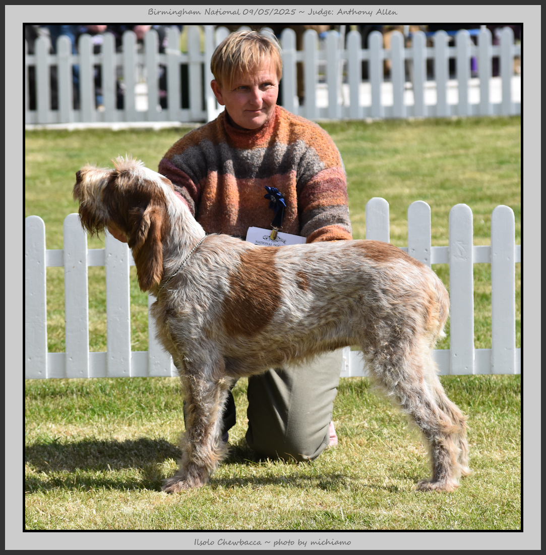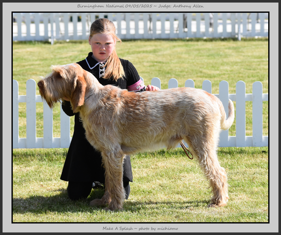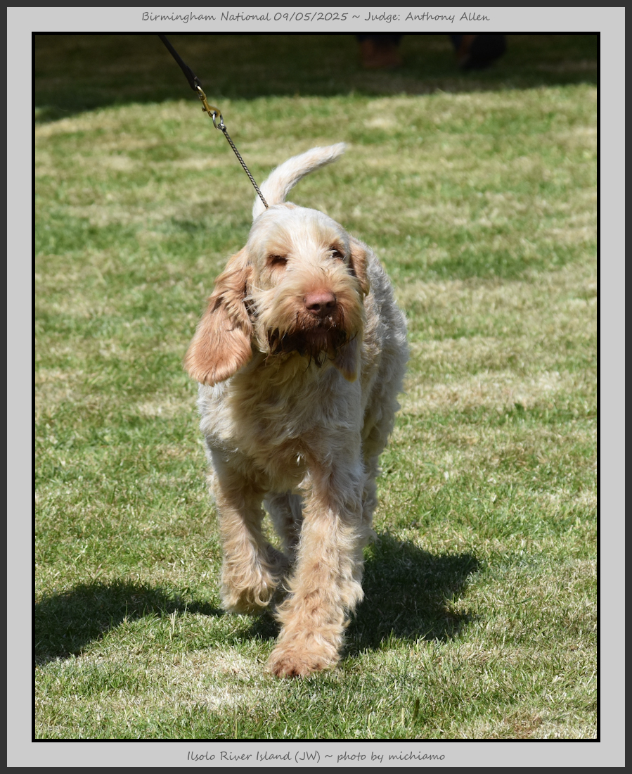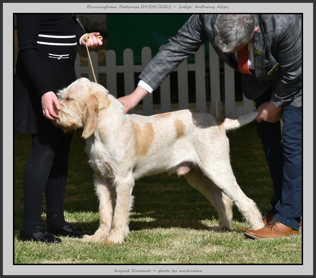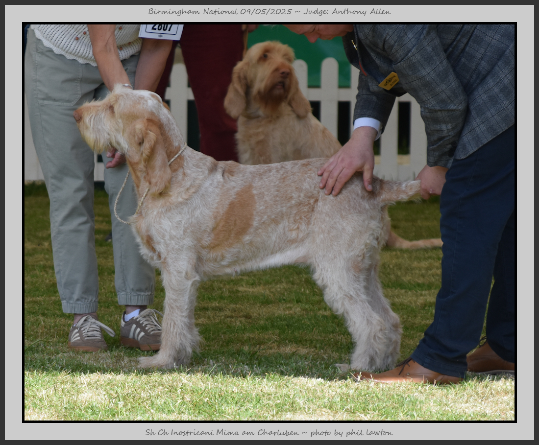 Clark & Sharp | A most impressive Italian Spinone dog who has the most wonderful outline and was in wonderful muscle condition and coat. He has a glorious head and expression. Correct topline and carries his tail correctly. On the move he just cannot be ignored and he really impressed in profile today as the big ring really suits him. Judge Lee Cox. |