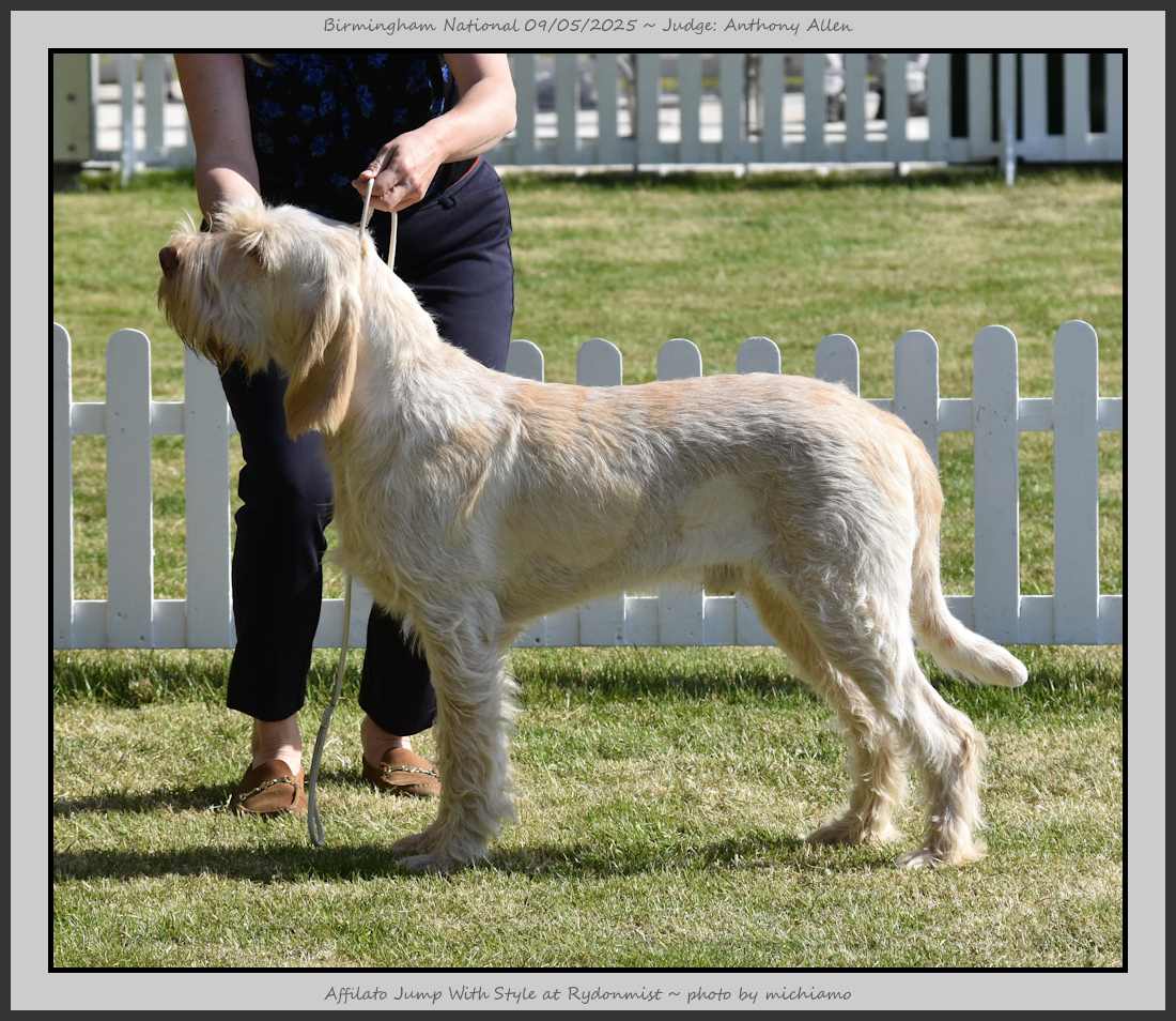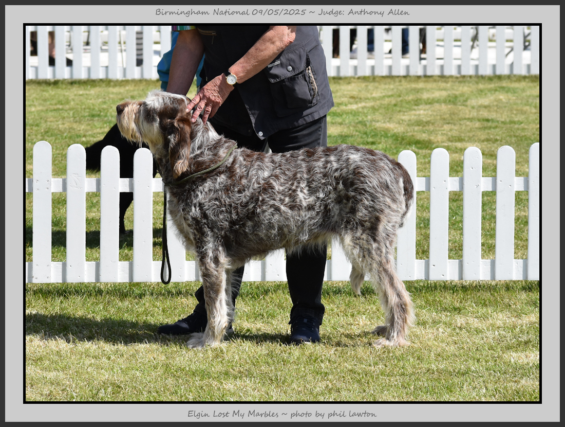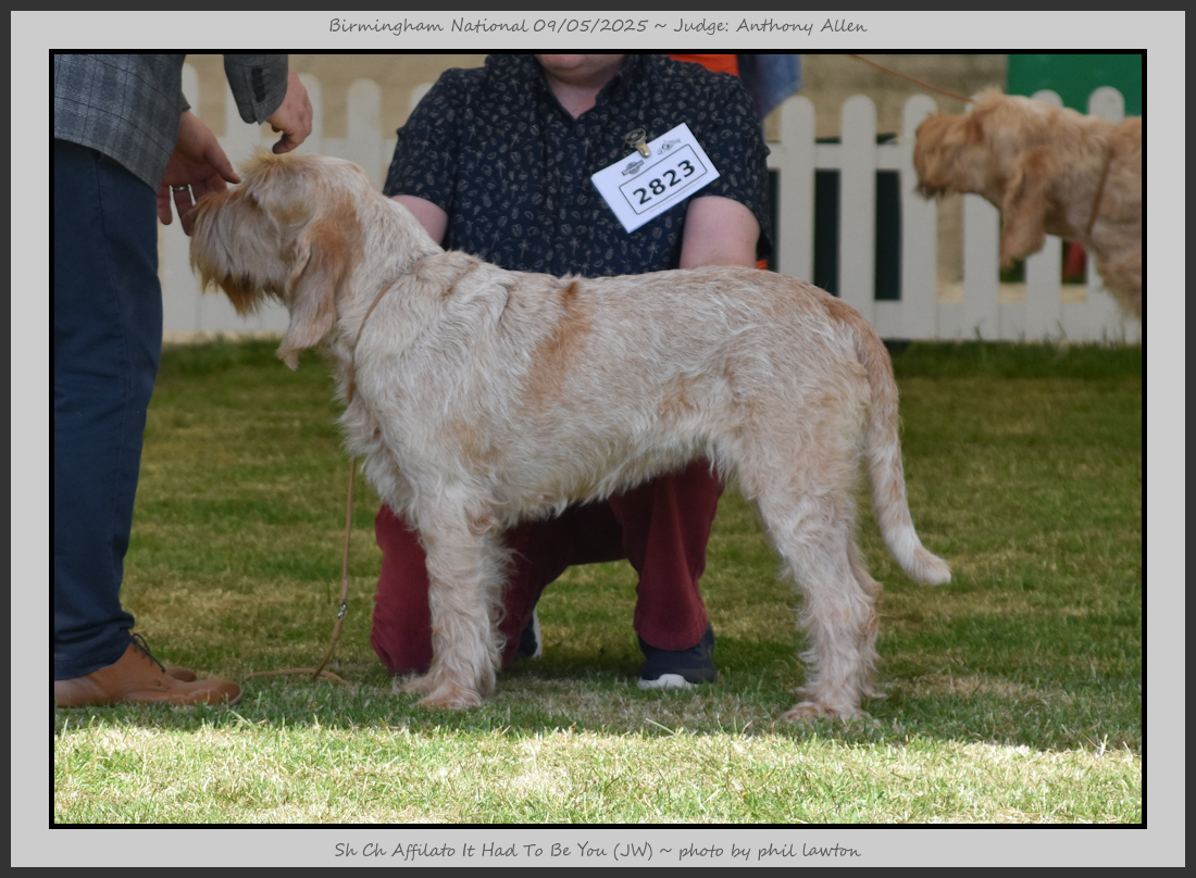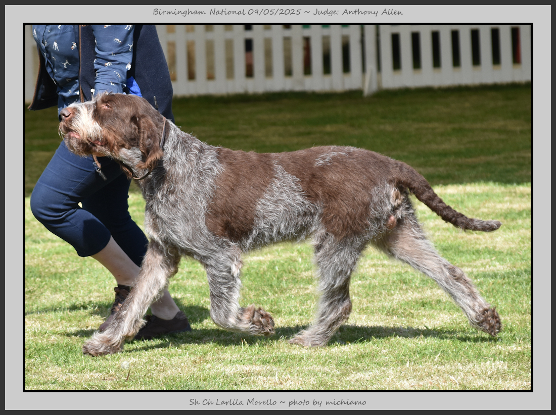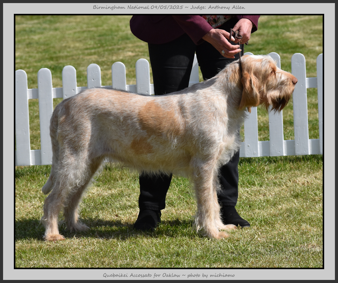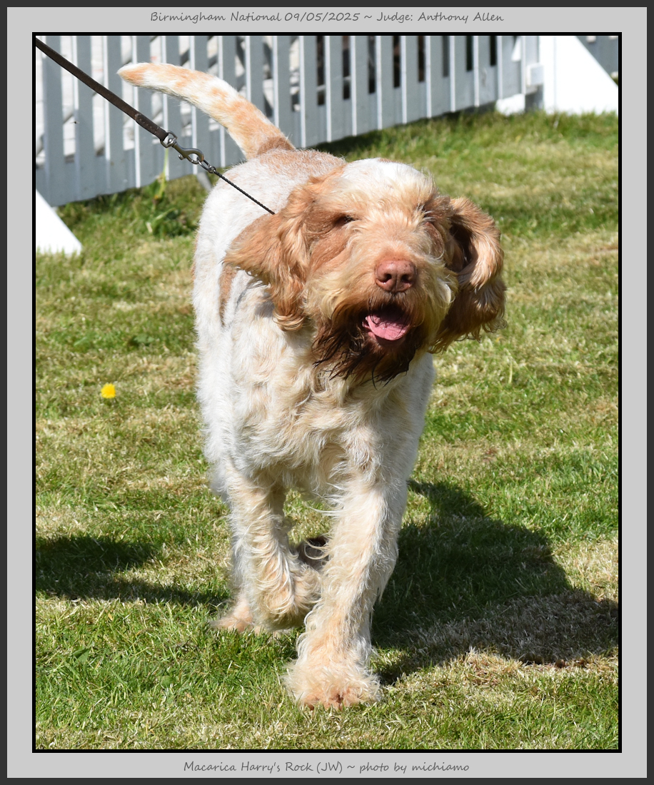 Clark & Sharp | A most impressive Italian Spinone dog who has the most wonderful outline and was in wonderful muscle condition and coat. He has a glorious head and expression. Correct topline and carries his tail correctly. On the move he just cannot be ignored and he really impressed in profile today as the big ring really suits him. Judge Lee Cox. |
