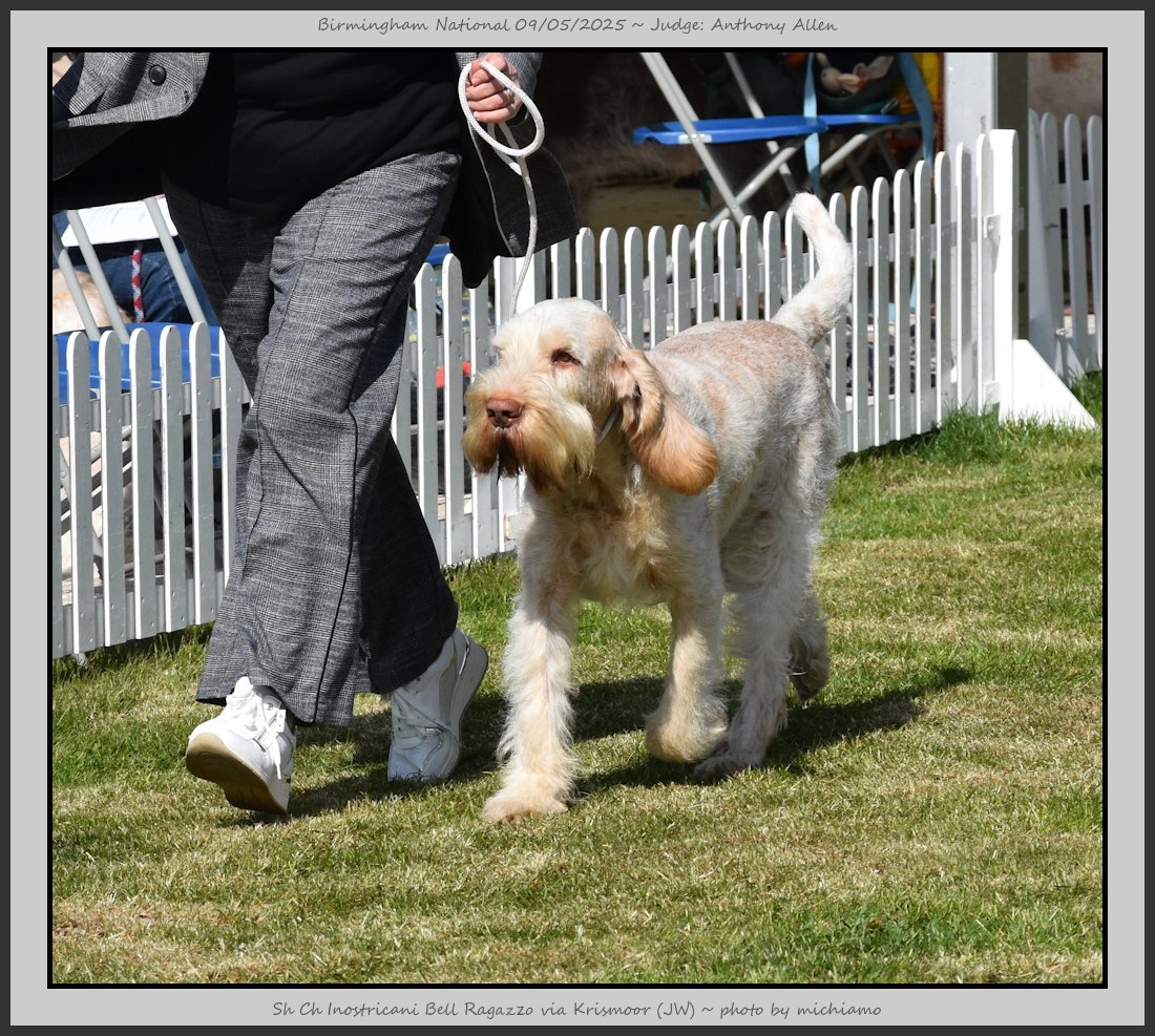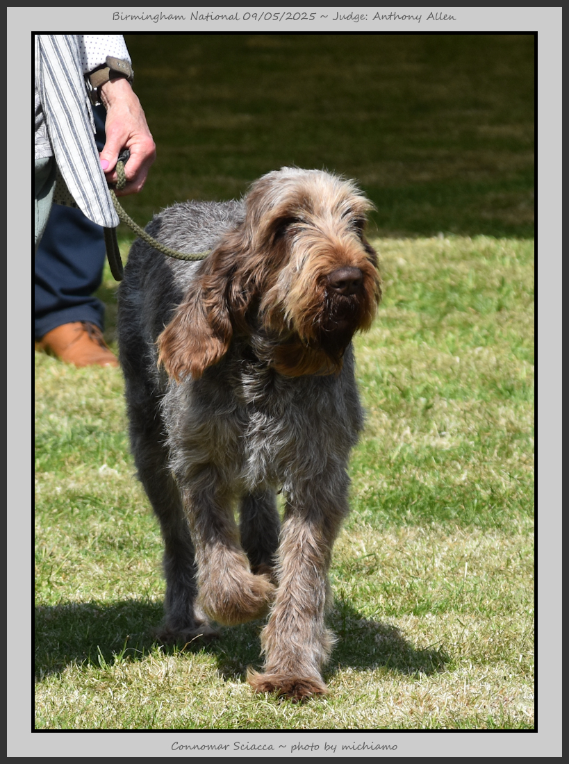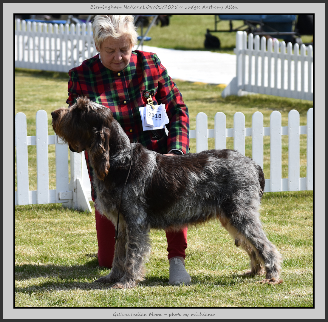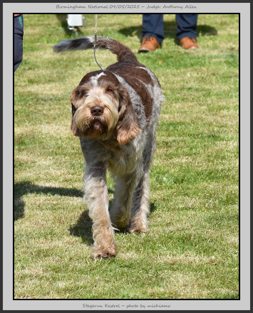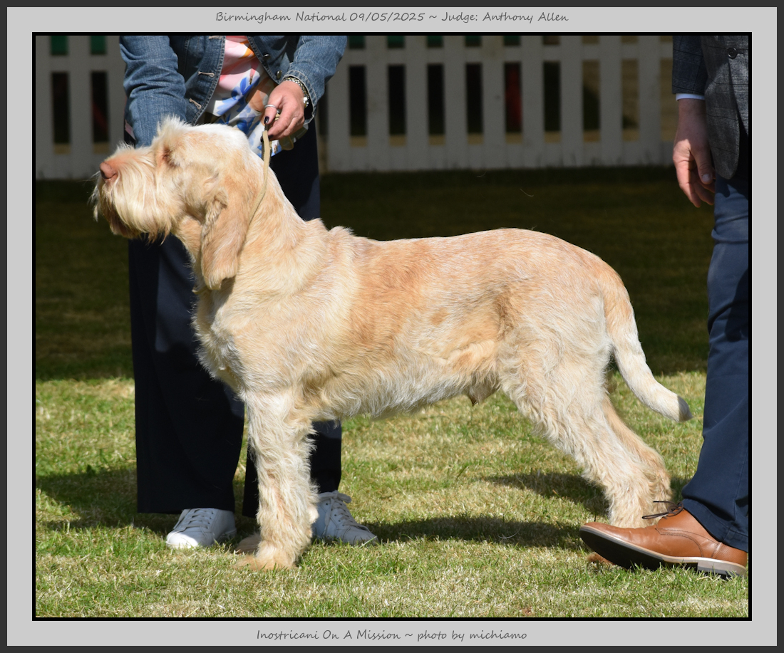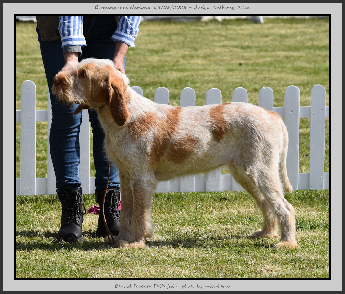 Clark & Sharp | A most impressive Italian Spinone dog who has the most wonderful outline and was in wonderful muscle condition and coat. He has a glorious head and expression. Correct topline and carries his tail correctly. On the move he just cannot be ignored and he really impressed in profile today as the big ring really suits him. Judge Lee Cox. |