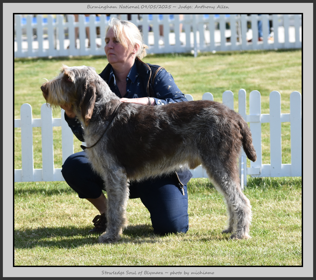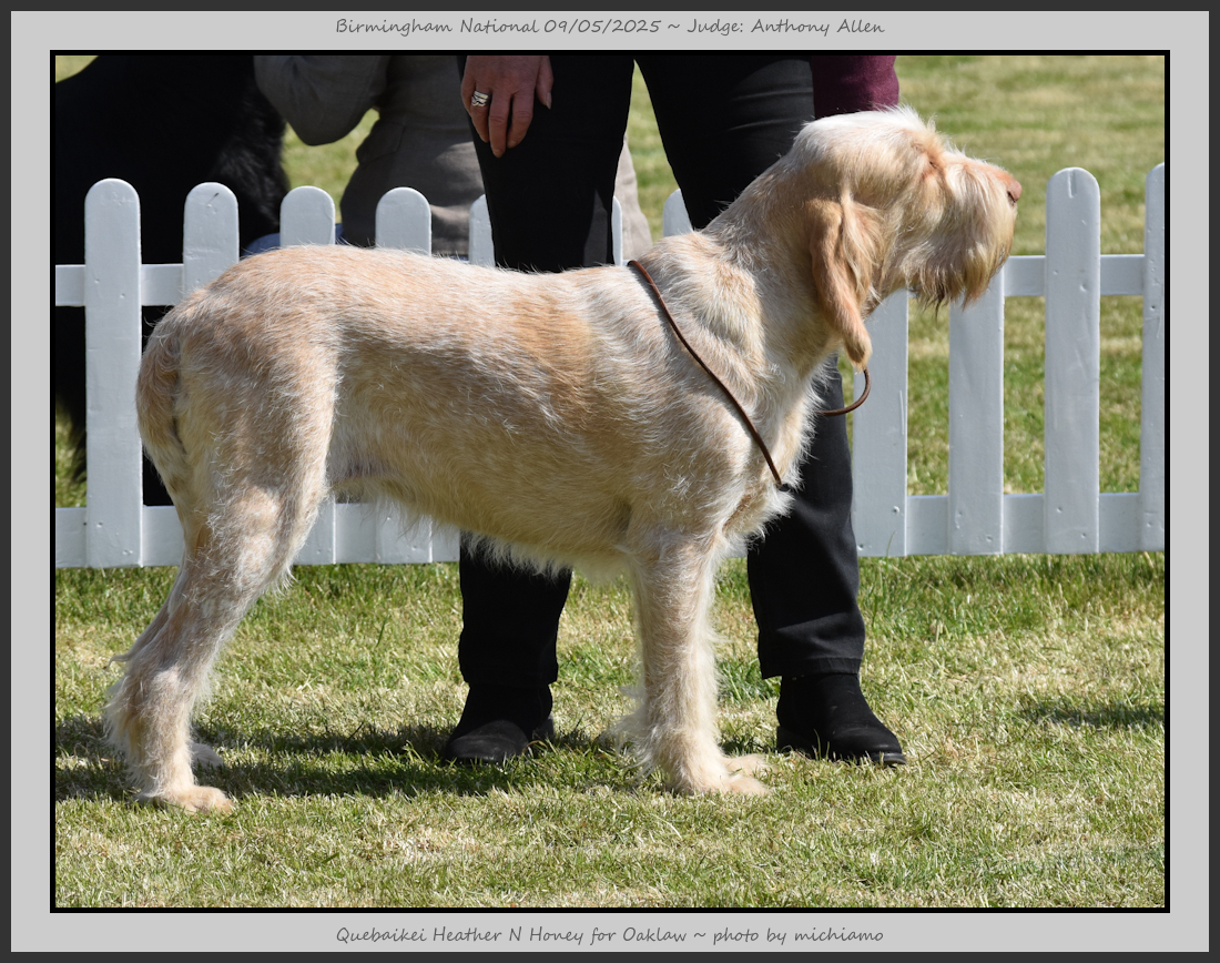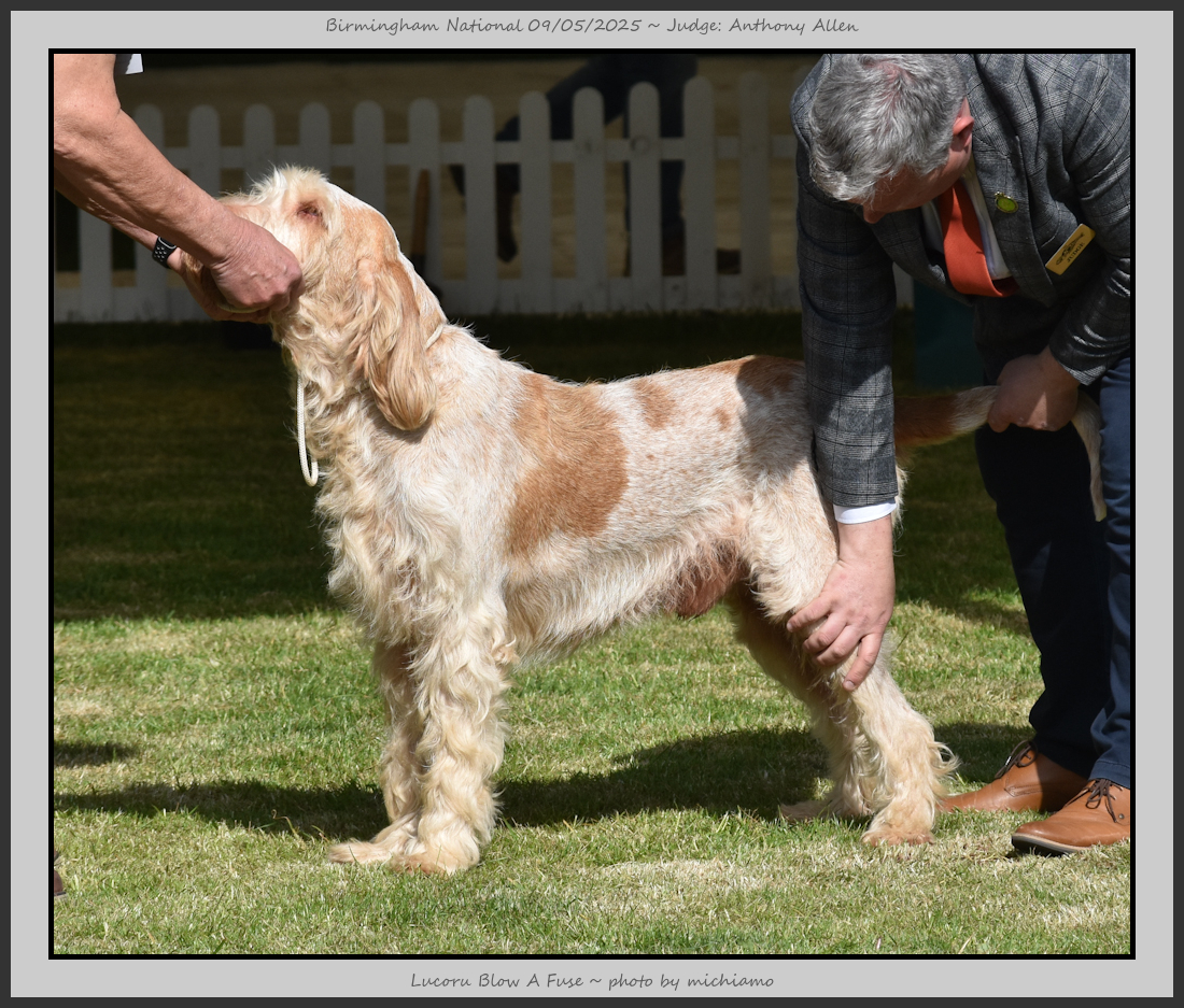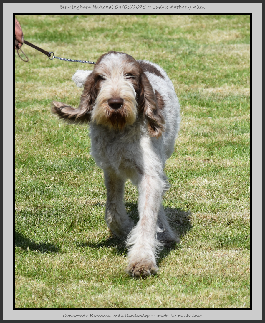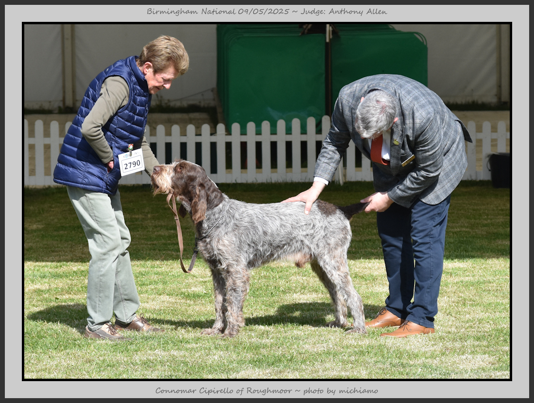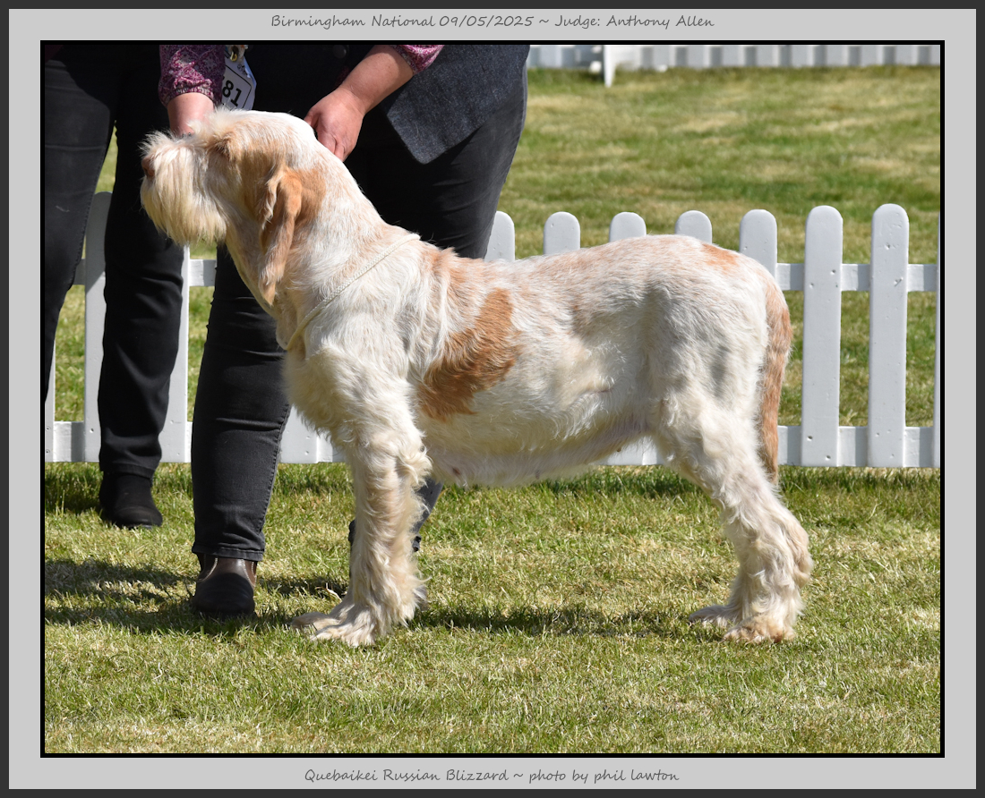 Clark & Sharp | A most impressive Italian Spinone dog who has the most wonderful outline and was in wonderful muscle condition and coat. He has a glorious head and expression. Correct topline and carries his tail correctly. On the move he just cannot be ignored and he really impressed in profile today as the big ring really suits him. Judge Lee Cox. |