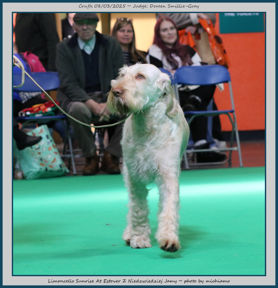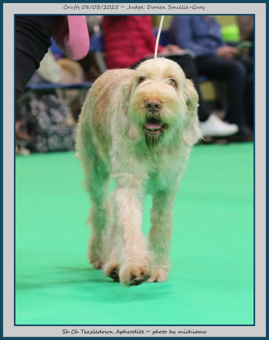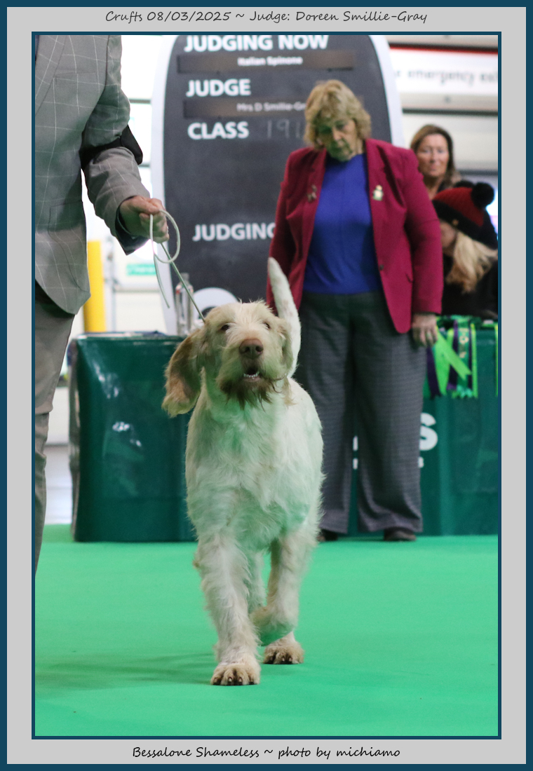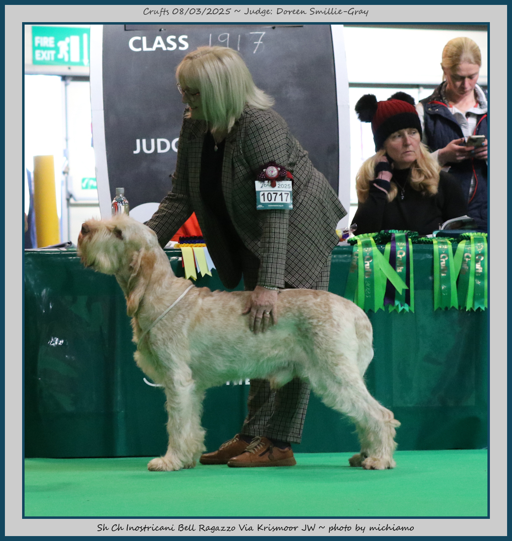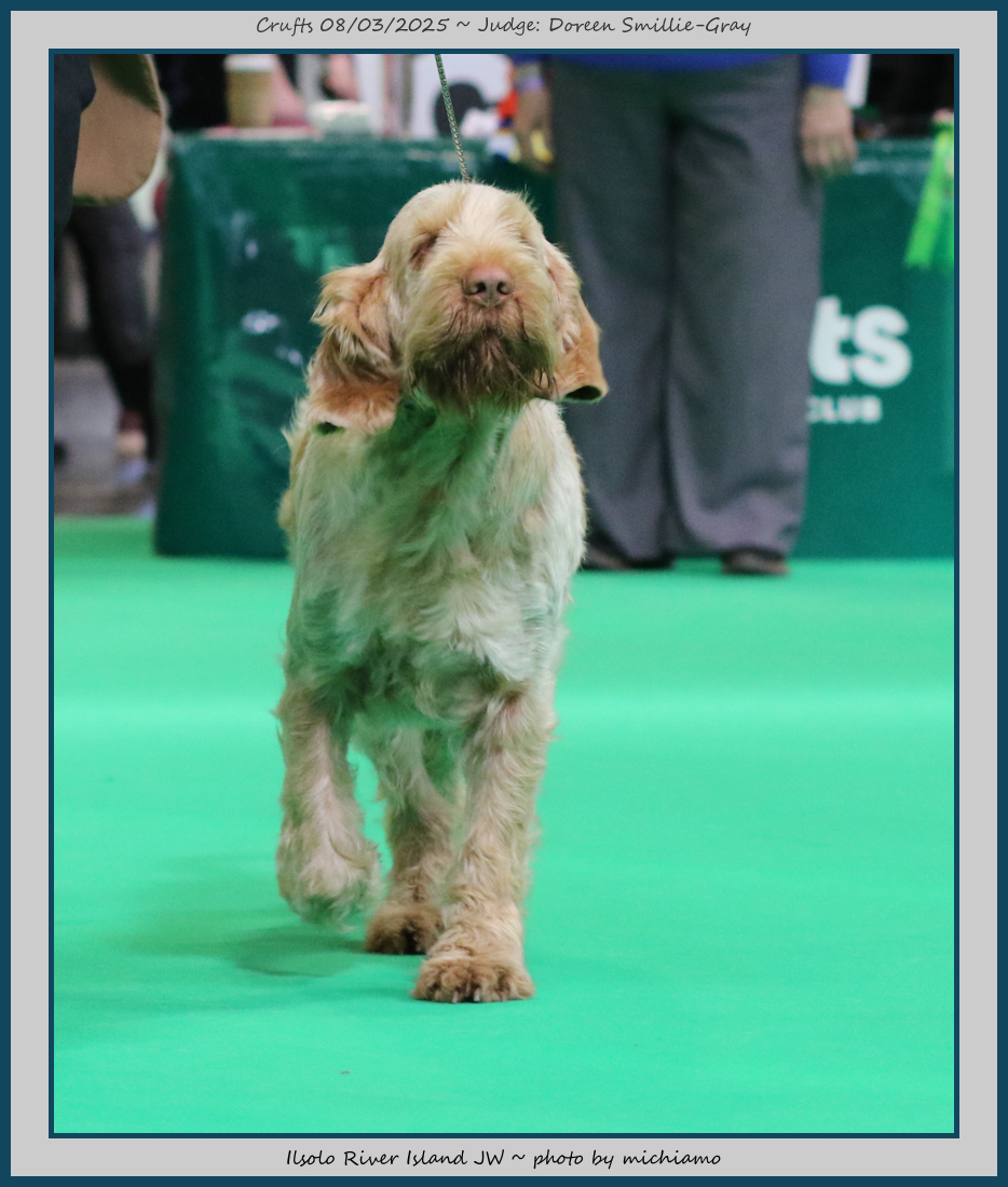 Mann | Stood alone but a worthy winner and also delighted to award him RCC. His young handler did a great job showing him. To me he typifies Italian Spinone, good expression and head, excellent depth and well muscled which enabled him to move around the ring with power and drive, moves true and good angulation. Good harsh coat, I shall watch his future in the show ring with interest. |