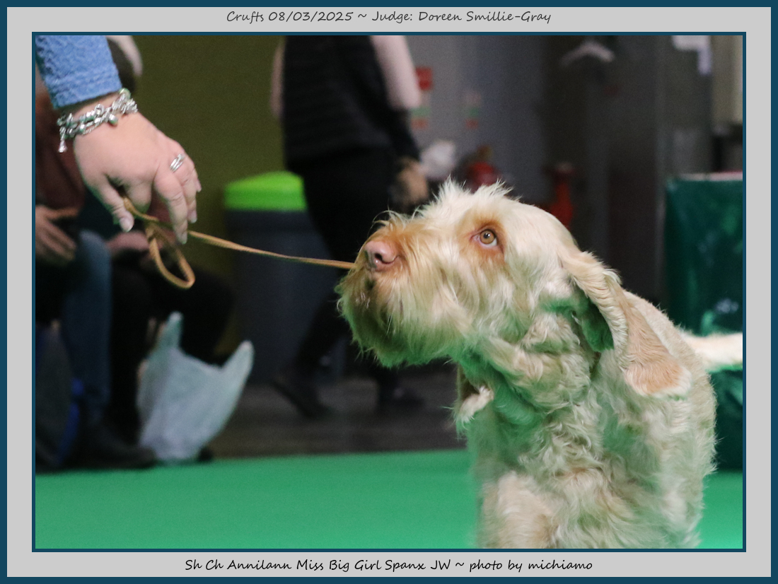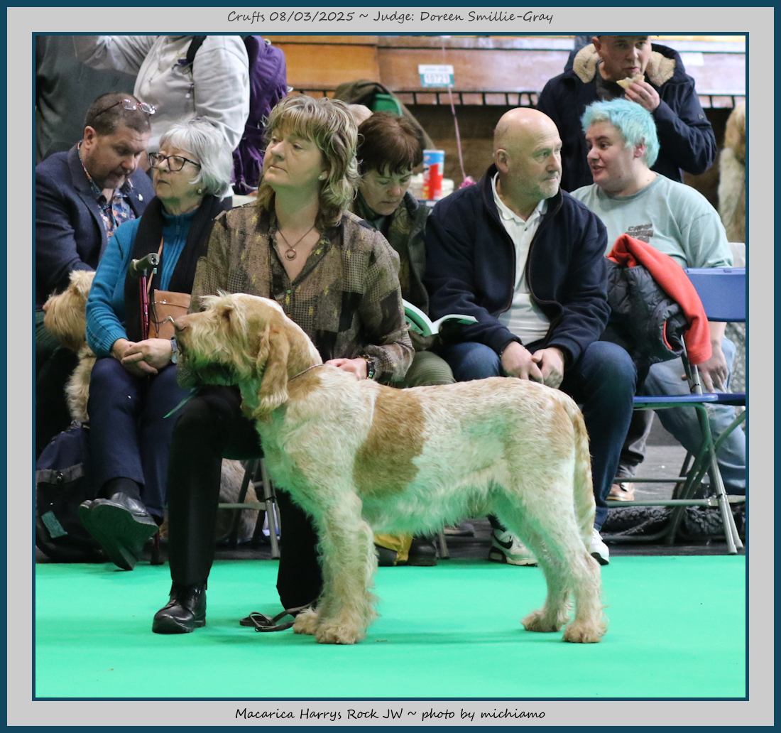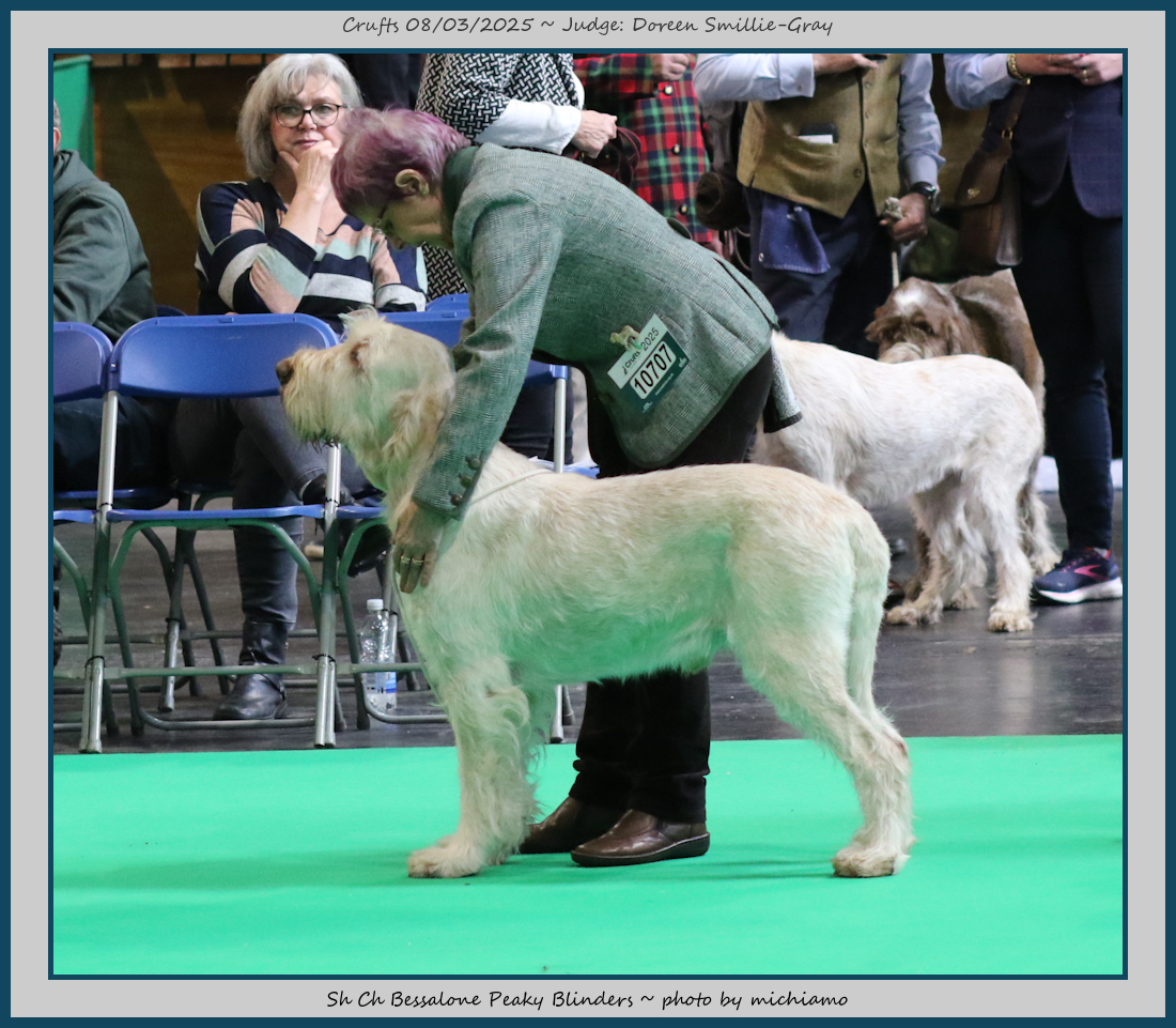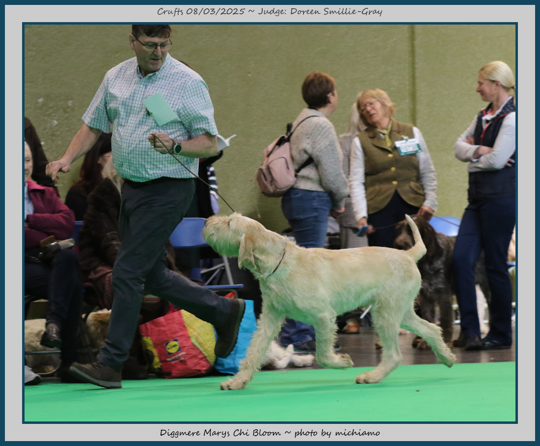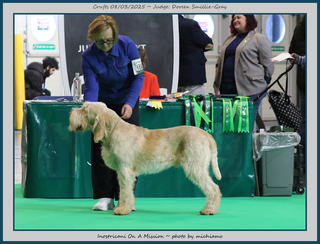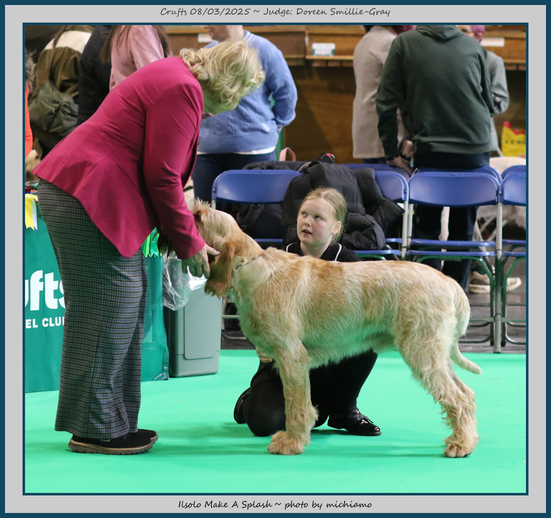 Mann | Stood alone but a worthy winner and also delighted to award him RCC. His young handler did a great job showing him. To me he typifies Italian Spinone, good expression and head, excellent depth and well muscled which enabled him to move around the ring with power and drive, moves true and good angulation. Good harsh coat, I shall watch his future in the show ring with interest. |
