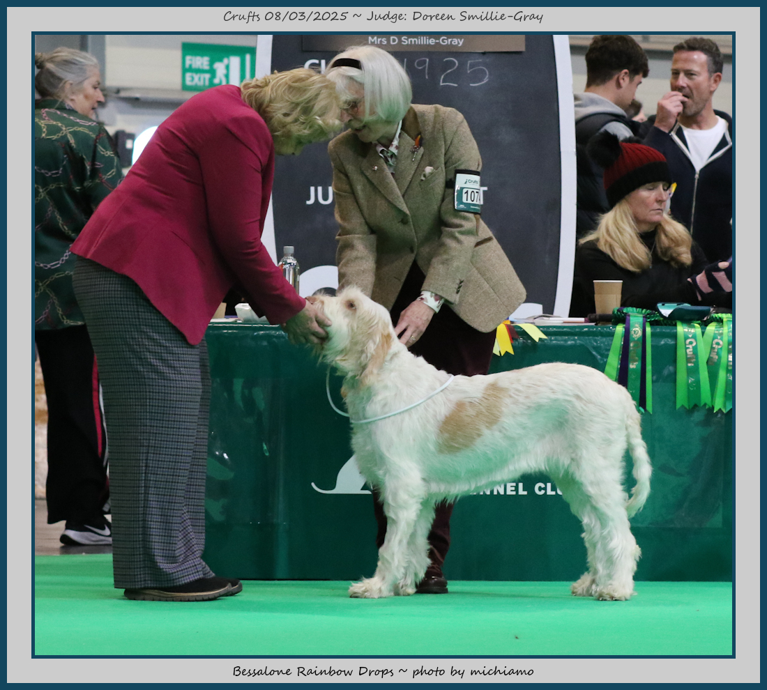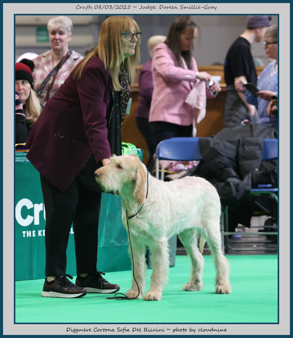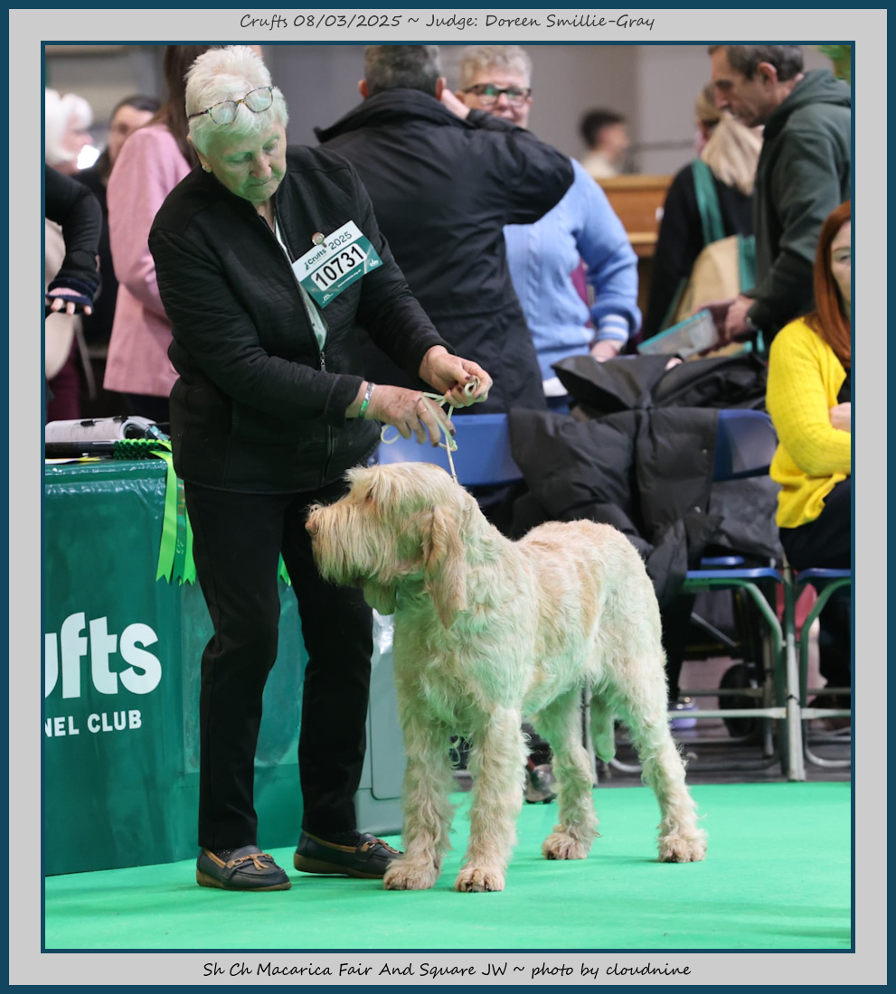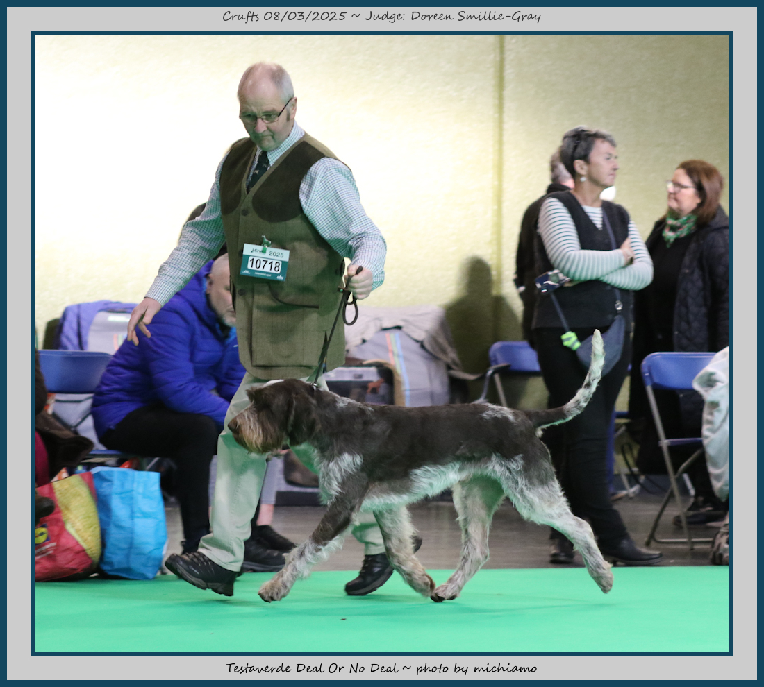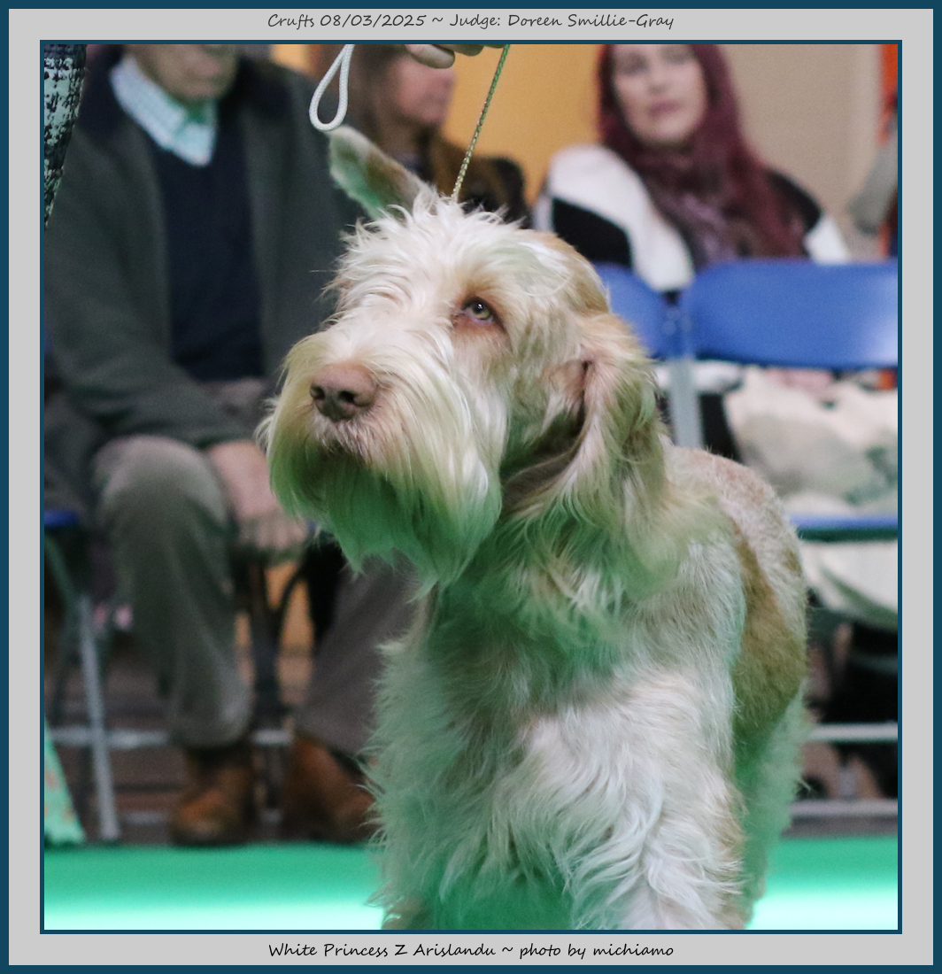 Mann | Stood alone but a worthy winner and also delighted to award him RCC. His young handler did a great job showing him. To me he typifies Italian Spinone, good expression and head, excellent depth and well muscled which enabled him to move around the ring with power and drive, moves true and good angulation. Good harsh coat, I shall watch his future in the show ring with interest. |