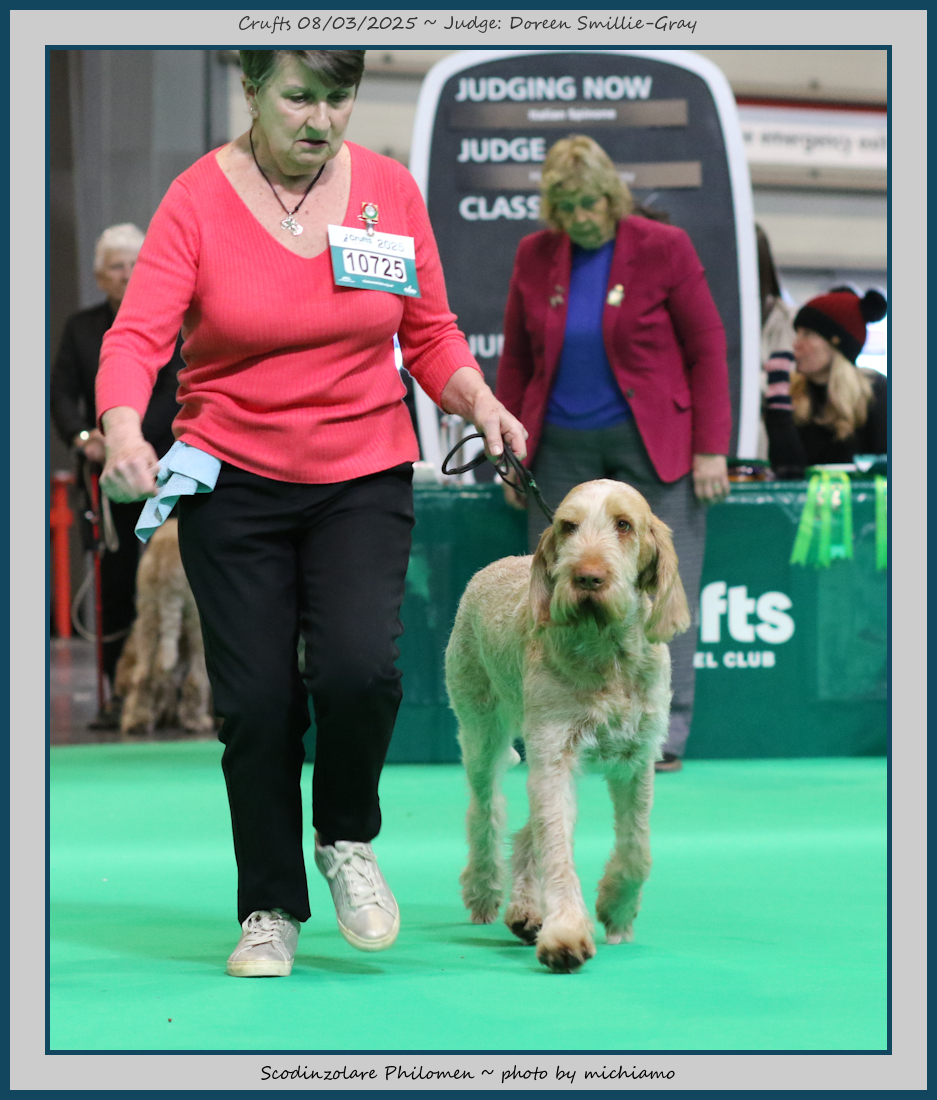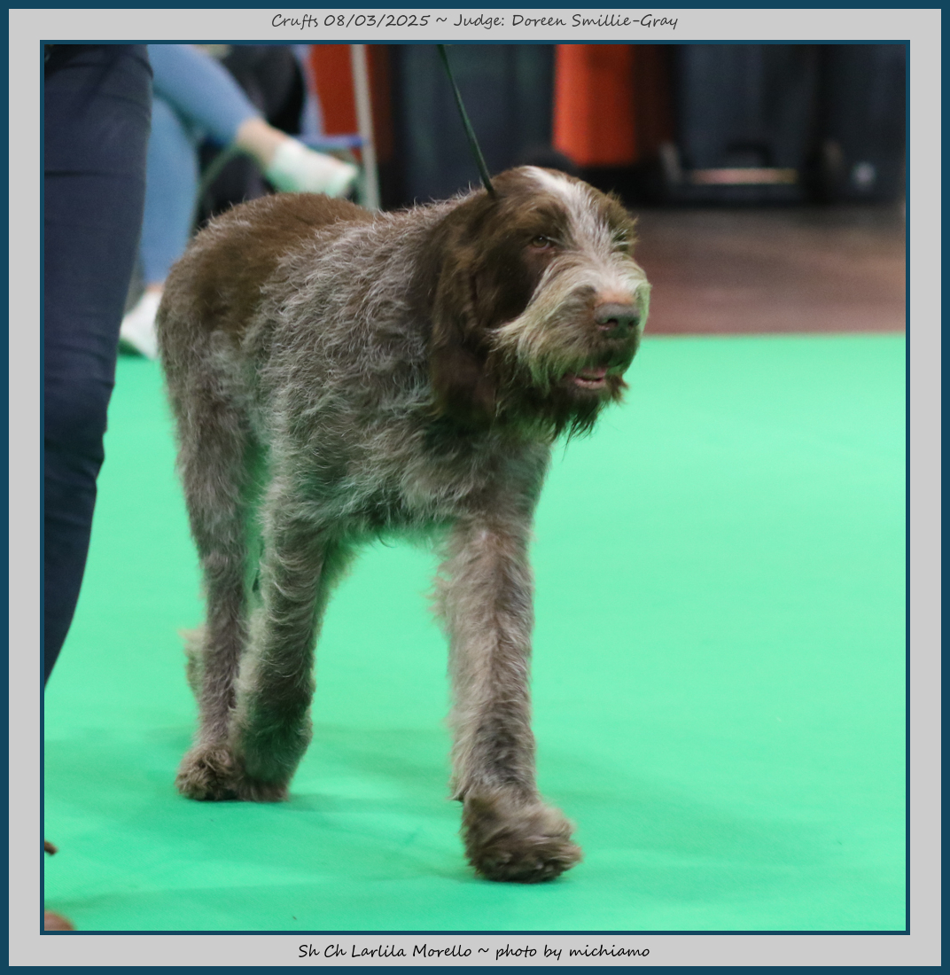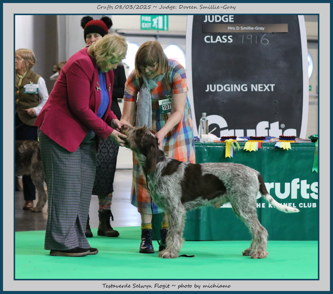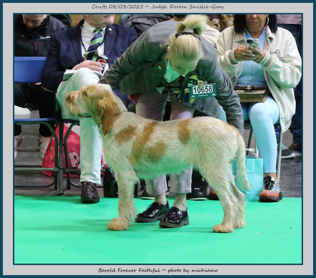Duncan | This handsome boy just says Spinone to me, excellent breed type, gorgeous head and expression, very good depth and angulation. Moves out really well and has good muscle. So unlucky to come up against my winner and the Junior Dog, but I am sure top honours will not be too far away. |
