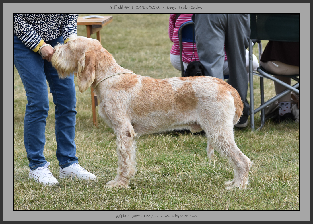 Kay | Very pretty bitch with classic head & eye, good earset. Short strong neck set into good shoulders. Balanced in outline, topline, tailset & carriage all good, good belly line. Good musculature which showed in her steady movement. Decent bone & neat feet. Coat coming through but still a little soft at present, lovely thick skin. MY BPiB. |