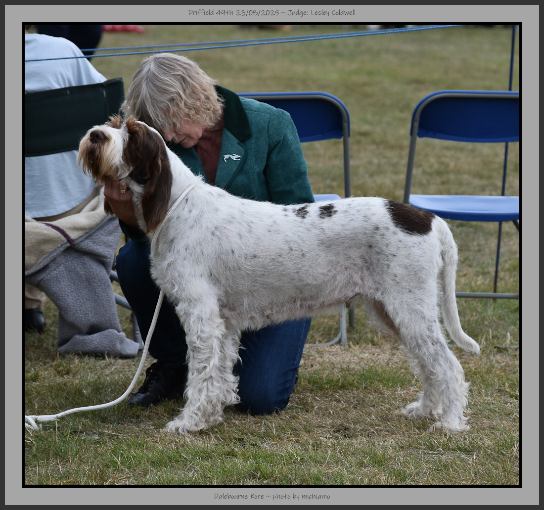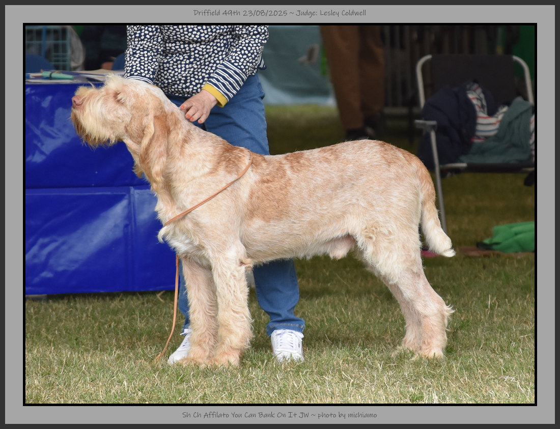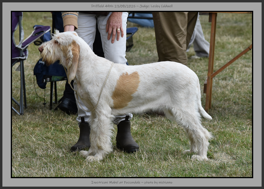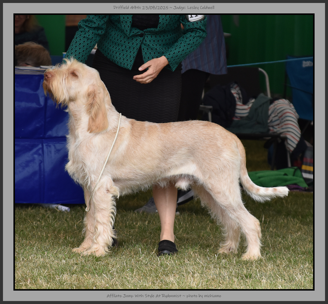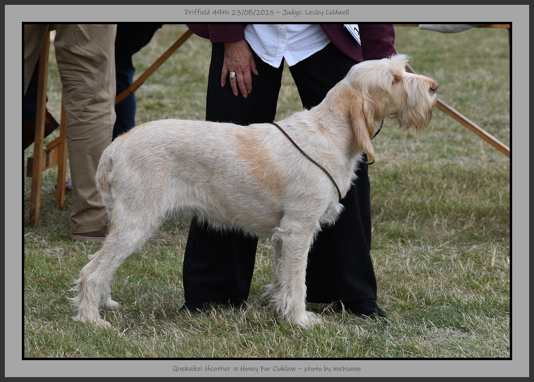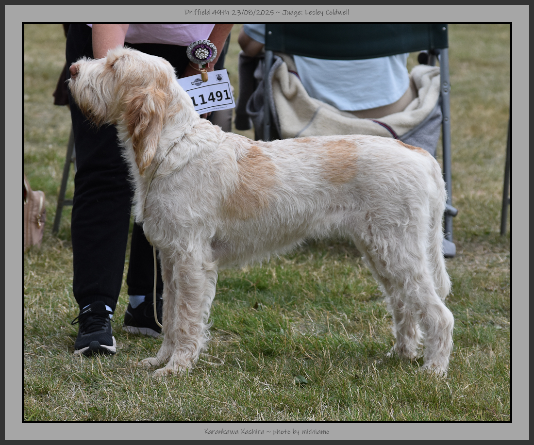 Hutt | Well furnished face with a kind eye of good colour, ears set on level with eyes. Divergent head planes, spongy nose & scissor bite with good depth to muzzle. Balanced outline although slightly longer in loin at present, decent topline & tailset. Carrying a heavier coat than some, but it was a great texture, thick skin. Good musculature & decent movement although she was checking out what had been over the ground previously, shortening the lead helped. |