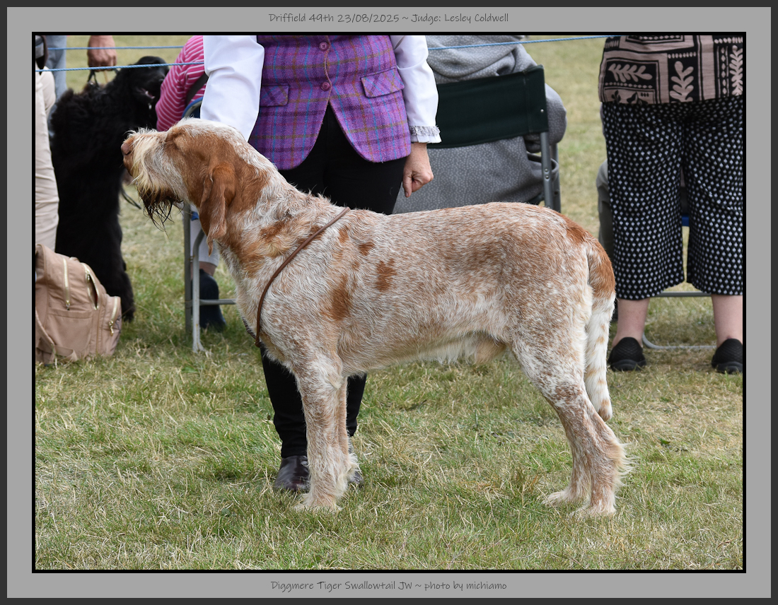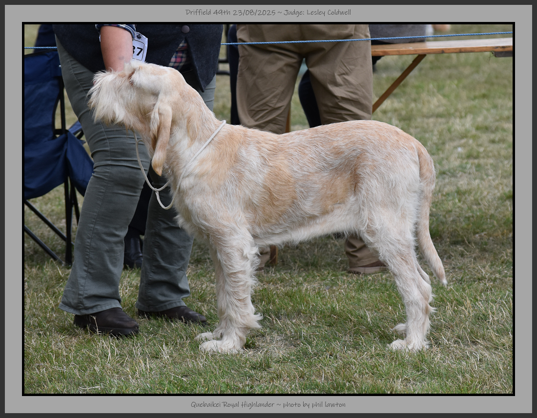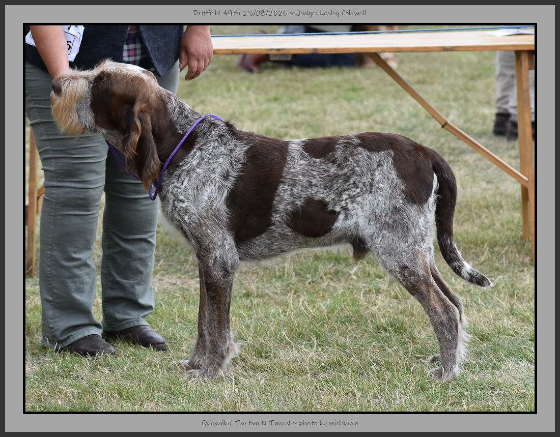 Burrows | Smart looking brown roan dog with the brown being a good shade, balanced outline. Grouchy expression, good head planes, large spongy nose, correct scissor bite, deep muzzle. Good topline, tailset & carriage, good bone, big feet & thick skin. Not carrying much coat but it was a harsh texture. Well muscled & moved with purpose around the ring. |