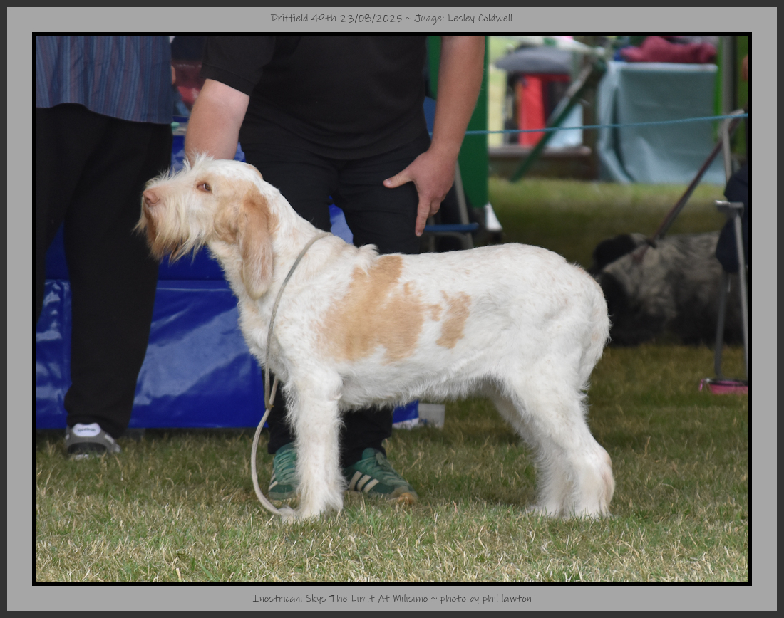 Sandy | Pretty girl with good facial furnishings, correct divergence, good eye colour, earset good, scissor bite, pronounced occiput & good crest to neck. Topline & tailset good as is underline. Good coat & lovely thick skin. Well muscled & competent mover, although a little close behind going away, just preferred the more positive movement of 1st. |