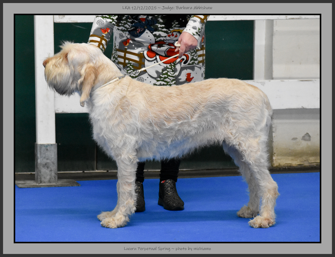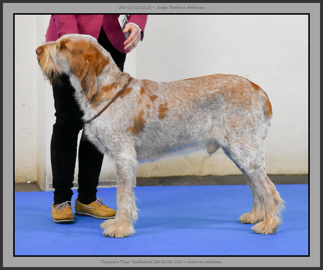 Cook | Divergent head planes. Coarse coat, tight skin. Good tail shape. Not quite the rear angulation. Square in profile, ideal tail set and good bone. Good depth of chest and good fore chest. |