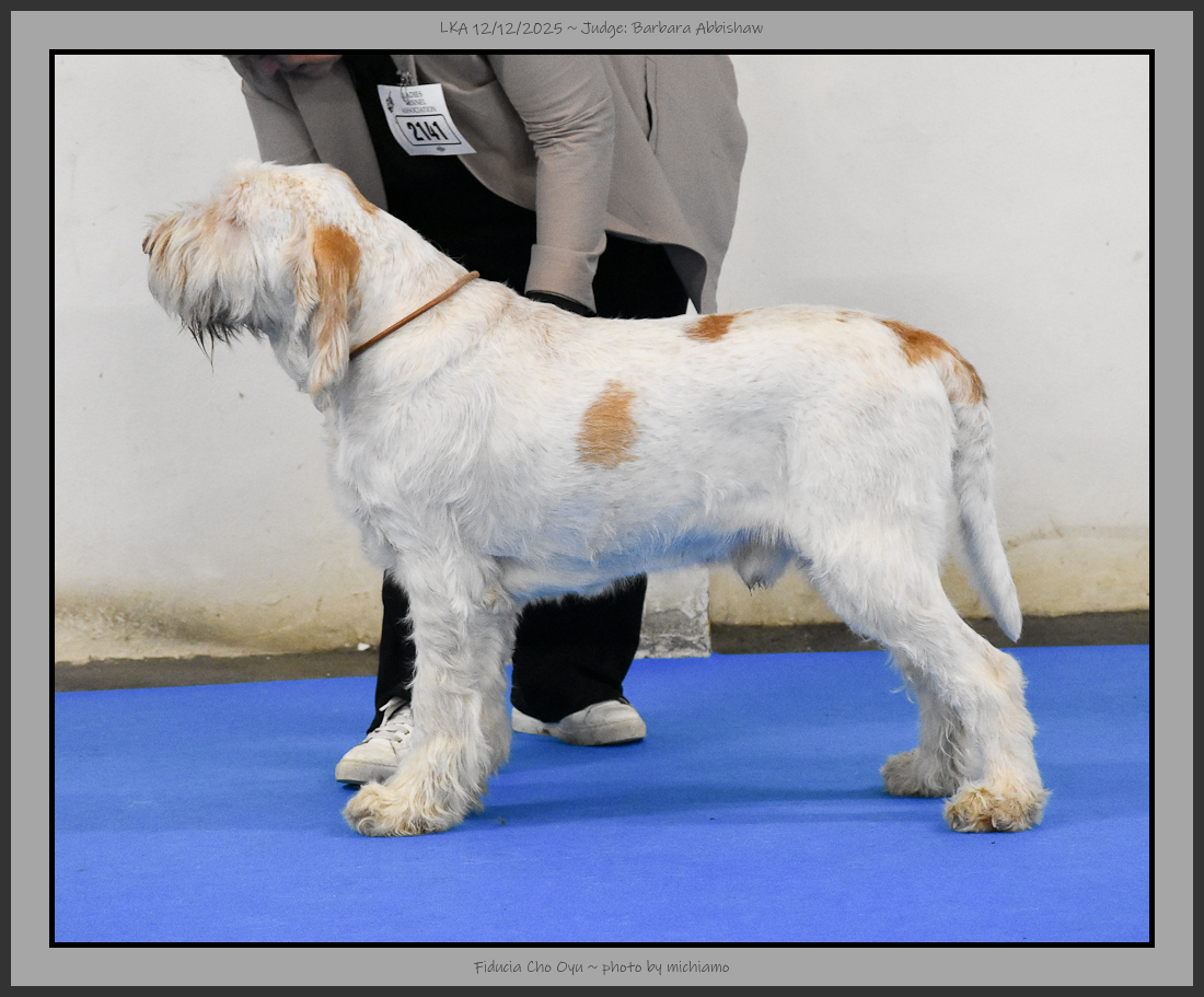 Giles | 2 year old white and orange. Square in outline, good rear angulation, strong head. Divergent head planes. Coarse coat, tight skin. Good tail shape. |
