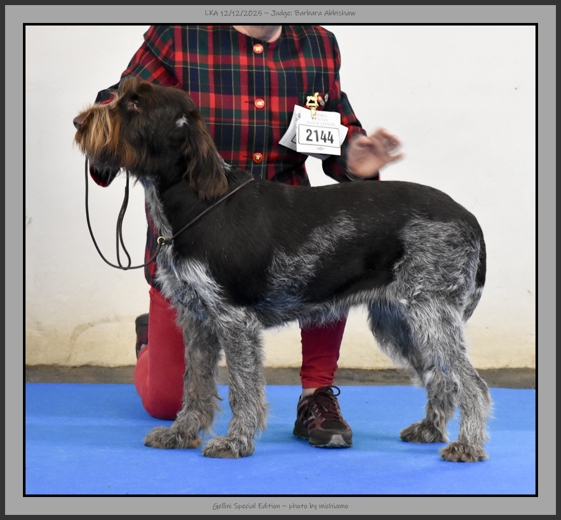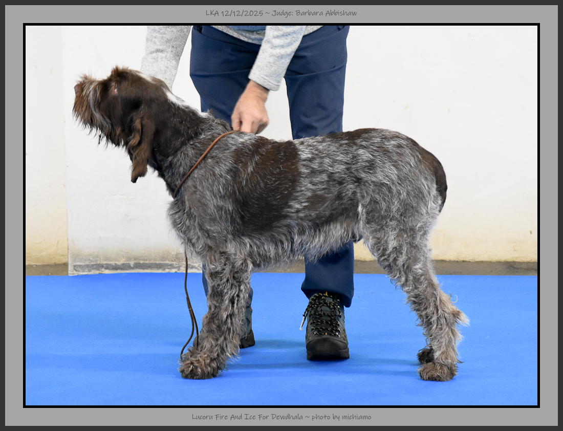 Gill | 7 year old brown roan. Heavy dog, good layback of shoulder, good rear angulation, good bone. Ideal coat and thick skin. Only beaten by one on drive. Reserve Dog CC. |
