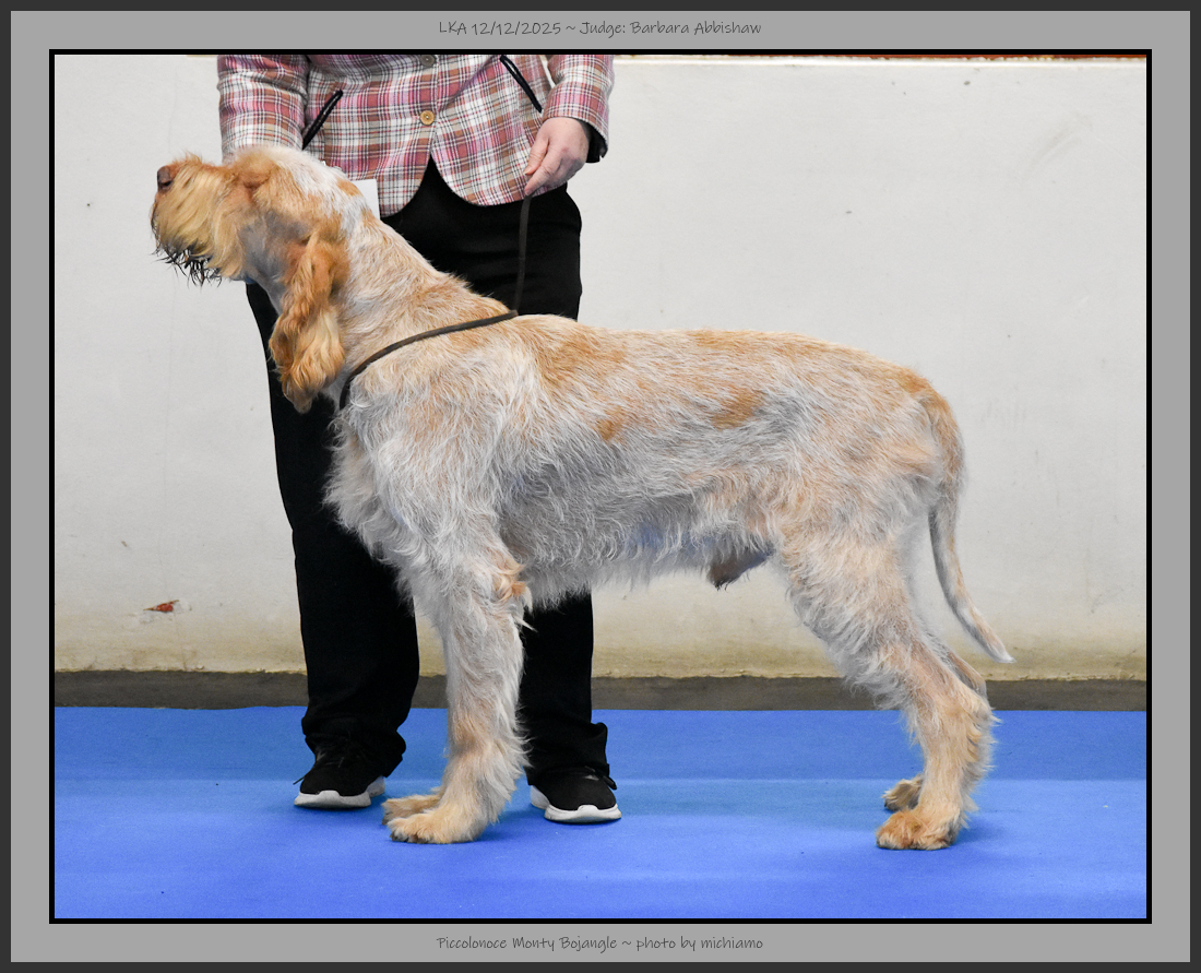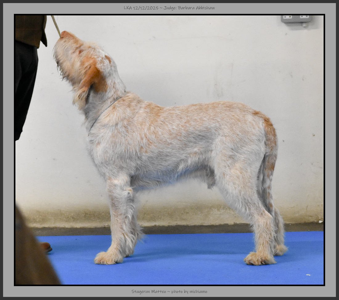 Rossiter | 14 month old brown roan. Good head, with ideal spinone qualities. Square in profile, good rear angulation with muscled quarters, ideal tail set and good bone. Good depth of chest and good fore chest. |