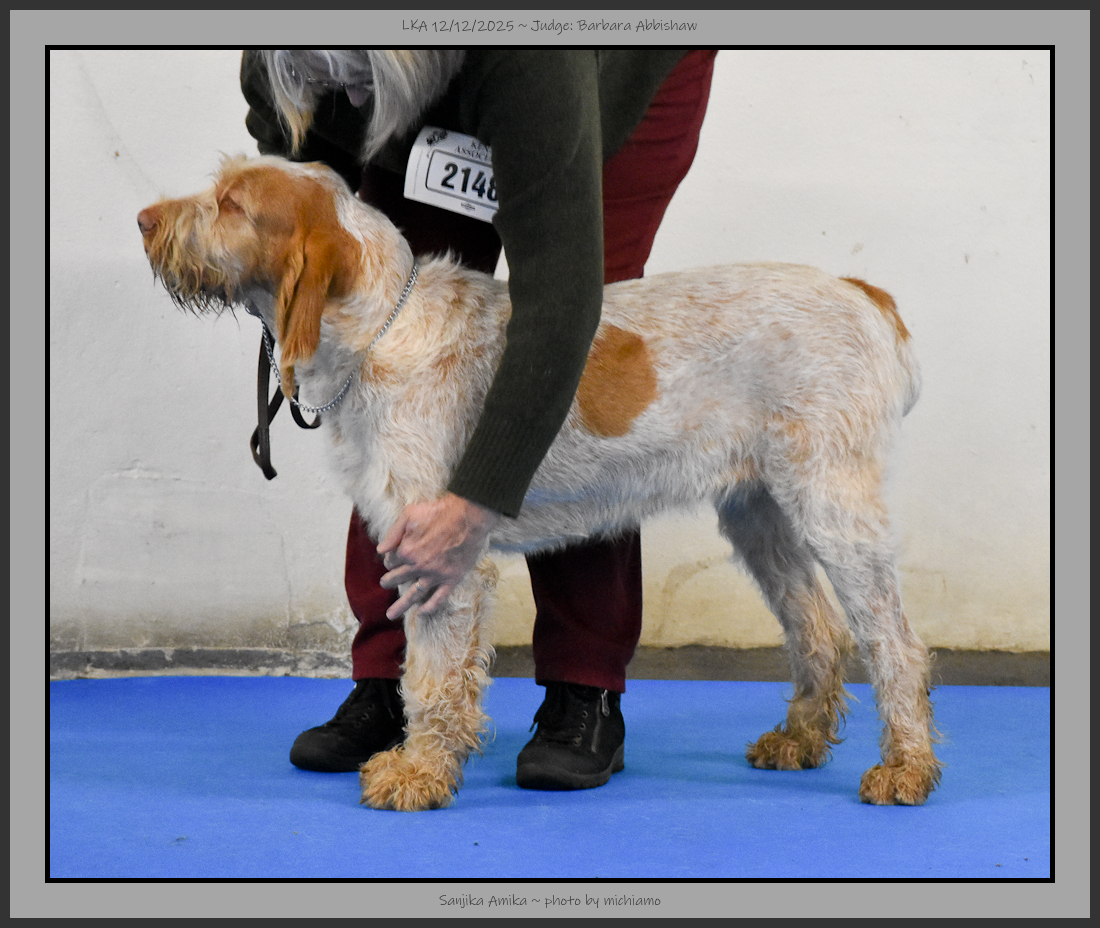 Corbett | Strong bitch. Balanced, white and orange. Good bone, feet and tailset. |