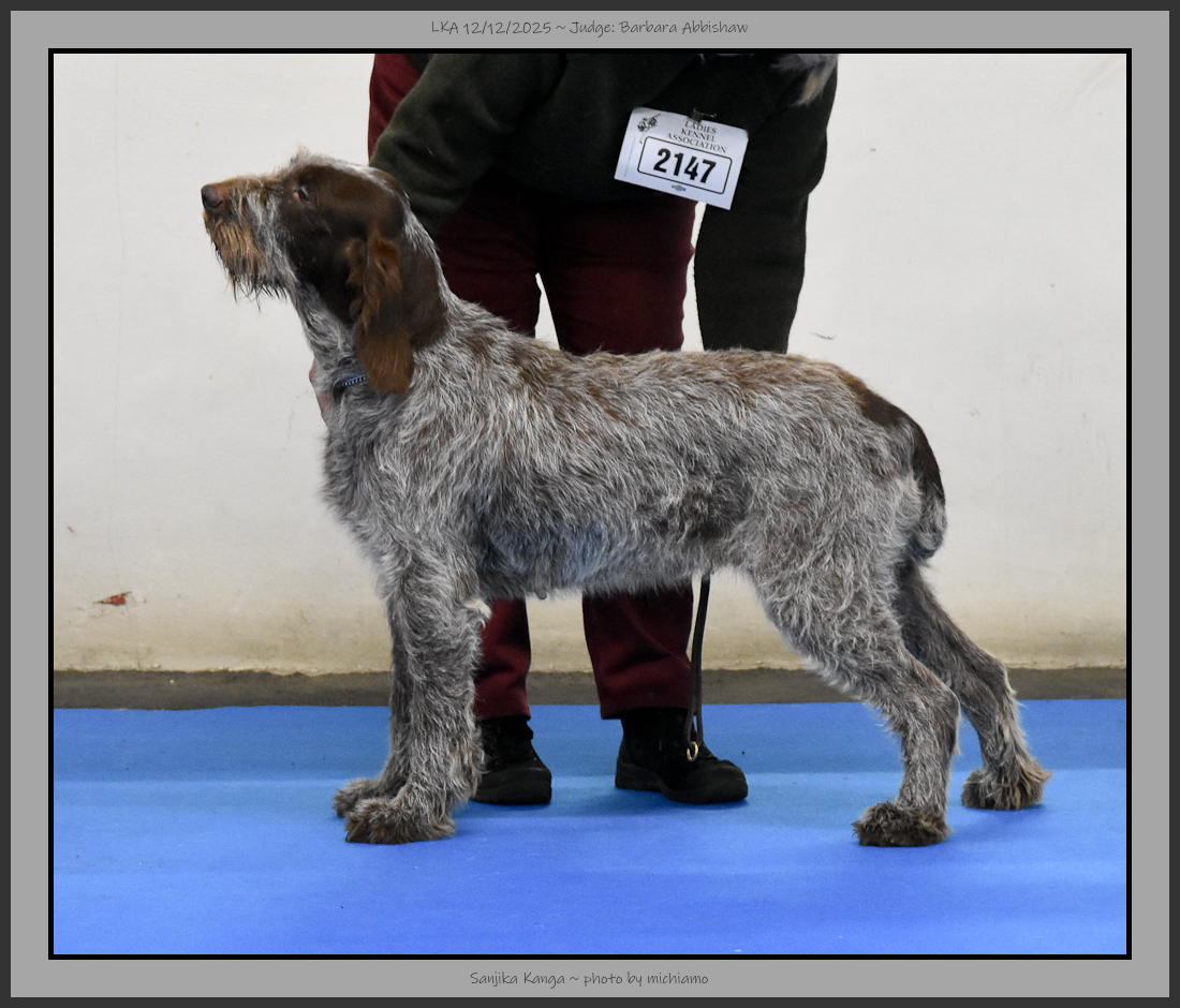 Wagh | A solidly made 7 month old brown roan who has good bone and substance. Divergent head planes equal in length from occiput to gently sloping stop, and from stop to the end of nose. Lean skull. Length from point of shoulder to point of buttocks equal to height at withers. Covering the ground correctly, pleasing to see in one so young. Best Puppy In Breed. |