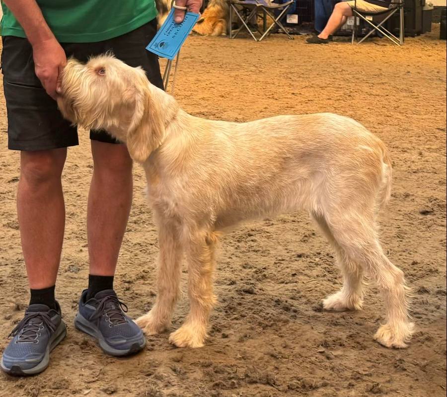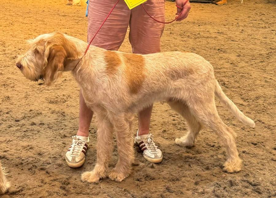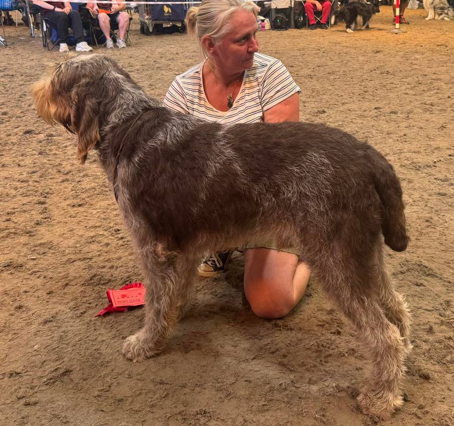 Giles | 6 month W/O bitch. Lovely lean head with good planes and very pleasing expression. Strong bone throughout and developing nicely. Much to like and I look forward to seeing her progress. Steady on the move and held her topline, with good tail carriage. Pleased to award her BP and delighted to hear she was awarded Puppy Group 4. |